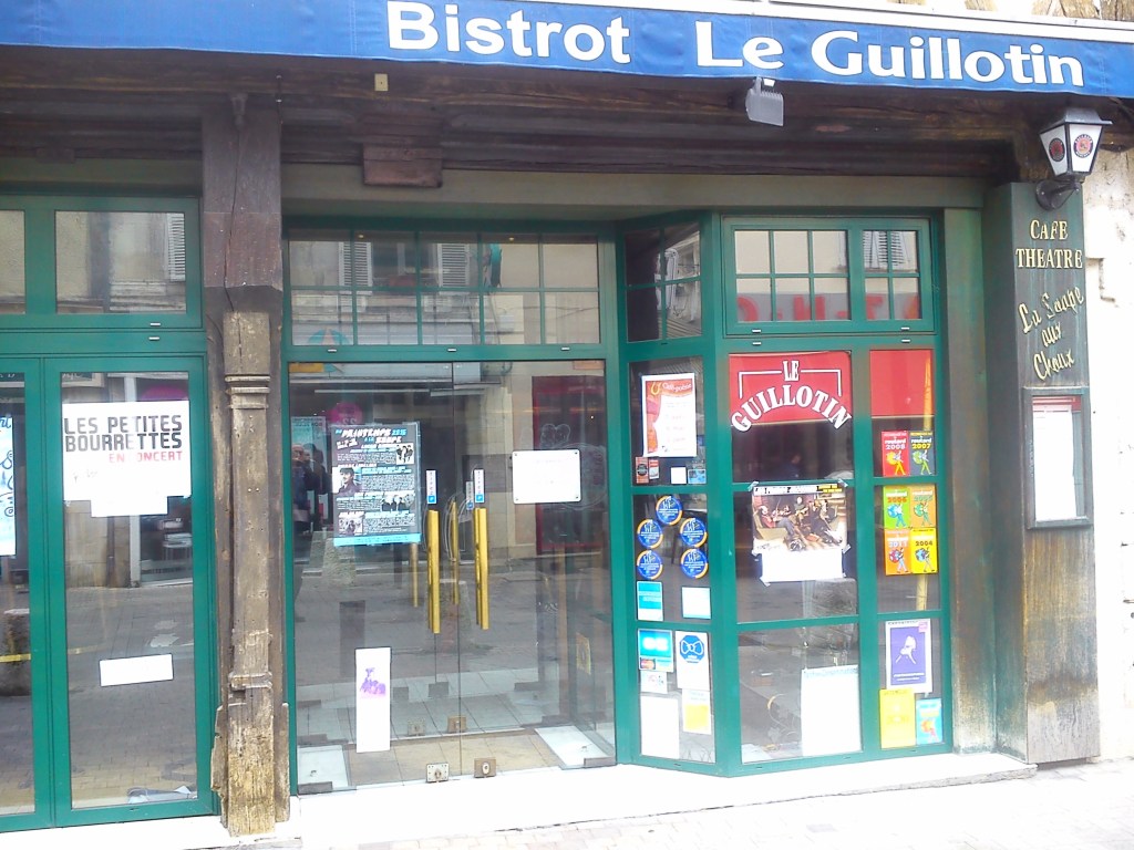 Elles y ont eu aussi leurs habitudes, moi également d’ailleurs et notamment au Guillotin, bien connu des berruyers pour sa table et également pour son actualité culturelle au 1er étage dans sa salle de café théâtre « La Soupe au Choux »… Un petit mot sur la porte indique que la patronne est absente pour congés, l’établissement est donc fermé! Je ne pourrai pas y faire une entrée pleine de nostalgie! Cependant les souvenirs des soirées passées à table pour savourer les grillades du patron et déguster quelques verres de Sancerre rouge, les yeux dans les yeux et la main dans la main me reviennent en mémoire.