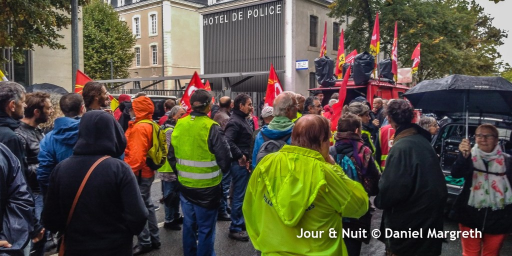 Avant de partir, ils ont crié des slogans de soutien (« Libérez notre camarade », « Pas de sanction pour Teddy »… ) et chanté « On est là, On est là, Même si Macron ne veux pas, Nous on est là, Pour l’honneur des travailleurs, Et pour un monde meilleur, Nous on est là! ».