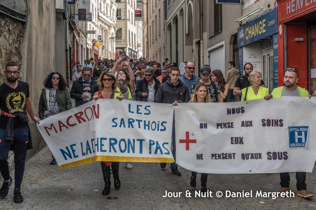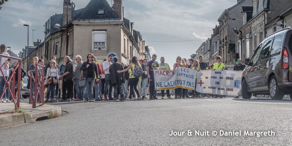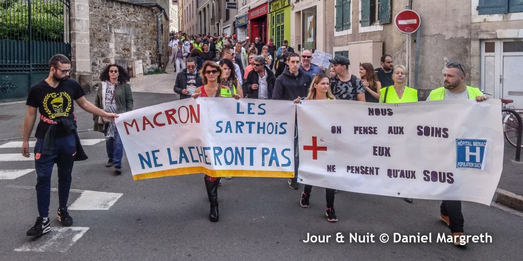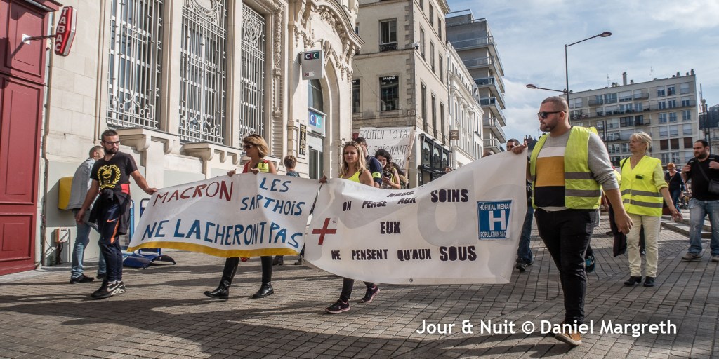 Puis à 14h30, départ de la manifestation pour rejoindre l’Hopital du Mans et soutenir le combat du Personnel des Urgences en grève depuis de nombreux mois, une façon pour les gilets jaunes de donner un coup de pouce à la convergence des luttes qu’ils souhaitent. Ils étaient donc une centaine à traverser la ville …