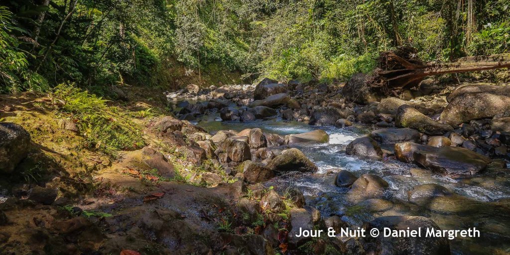 Le chemin assez facile au début s’avère plus difficile à cause de la pente qui prend progressivement de l’ampleur et du chemin en partie emporté par les pluies tropicales et parfois très glissants… Une fois arrivé à la rivière, il faut remonter le courant environ pendant 5 minutes pour découvrir la chute d’eau tout en faisant très attention en marchant sur les rochers qui peuvent être particulièrement glissants à cause de l’humidité ambiante. Mais quel spectacle que cette chute de quelques mètres dans un bruit assourdissant et la couleur fantastique de l’eau et des rochers.