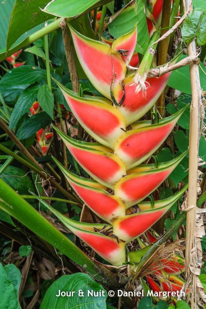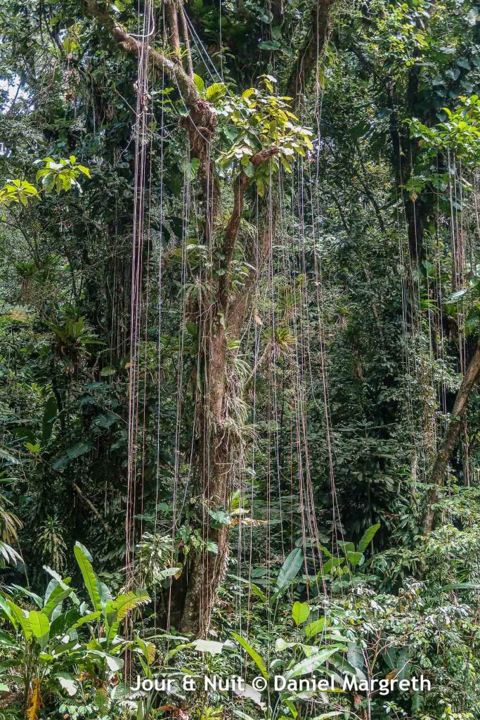 Après la traversée d’une bananeraie sur un chemin facile, il faut plonger vers la rivière Saint Louis que nous entendons sans la voir à cause de la végétation luxuriante de la forêt tropicale…
