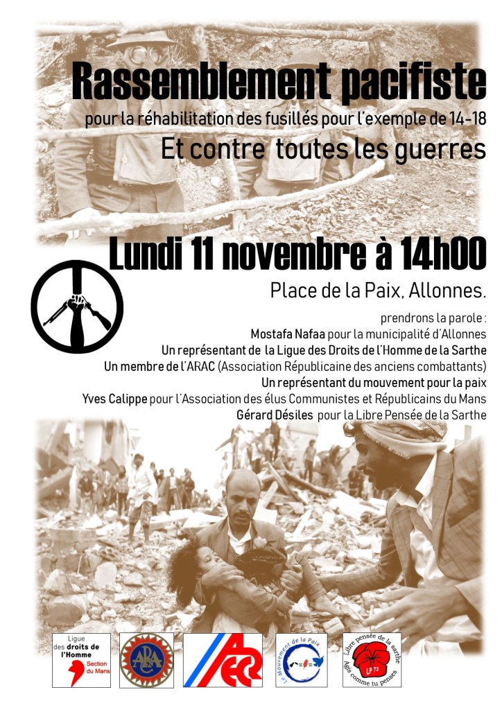 Une trentaine de personnes se sont déplacés au monument d’Allonnes « Pour la paix et la liberté aux victimes des guerres » à l’appel de la Ligue des Droits de l’Homme du Mans, de l’Association Républicaine des Anciens Combattants, du Mouvement de la Paix 72, de l’Association des Elus Communistes et Républicains du Mans, de la Libre Pensée de la Sarthe et de la mairie d’Allonnes pour participer au rassemblement pacifiste pour la réhabilitation des fusillés pour l’exemple de 14-18 et contre toutes les guerres.