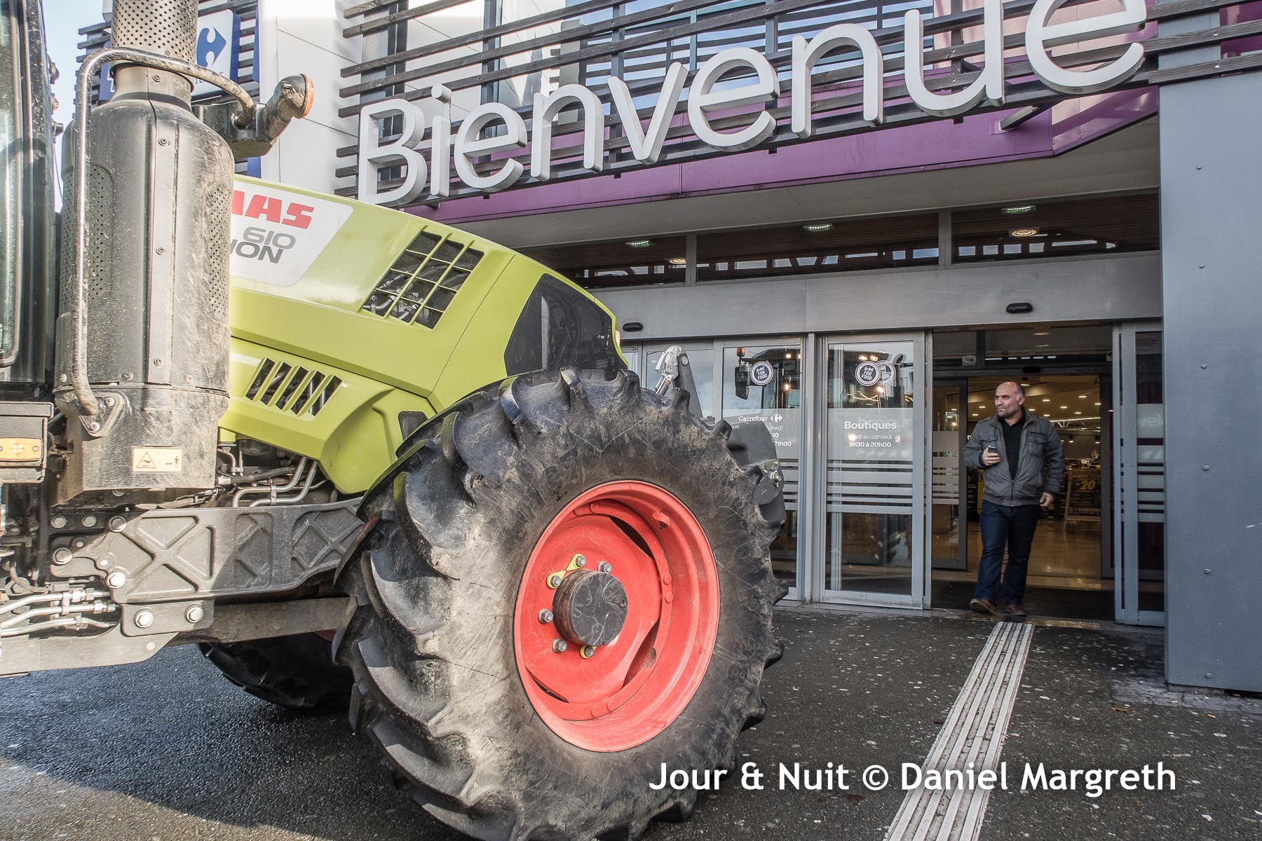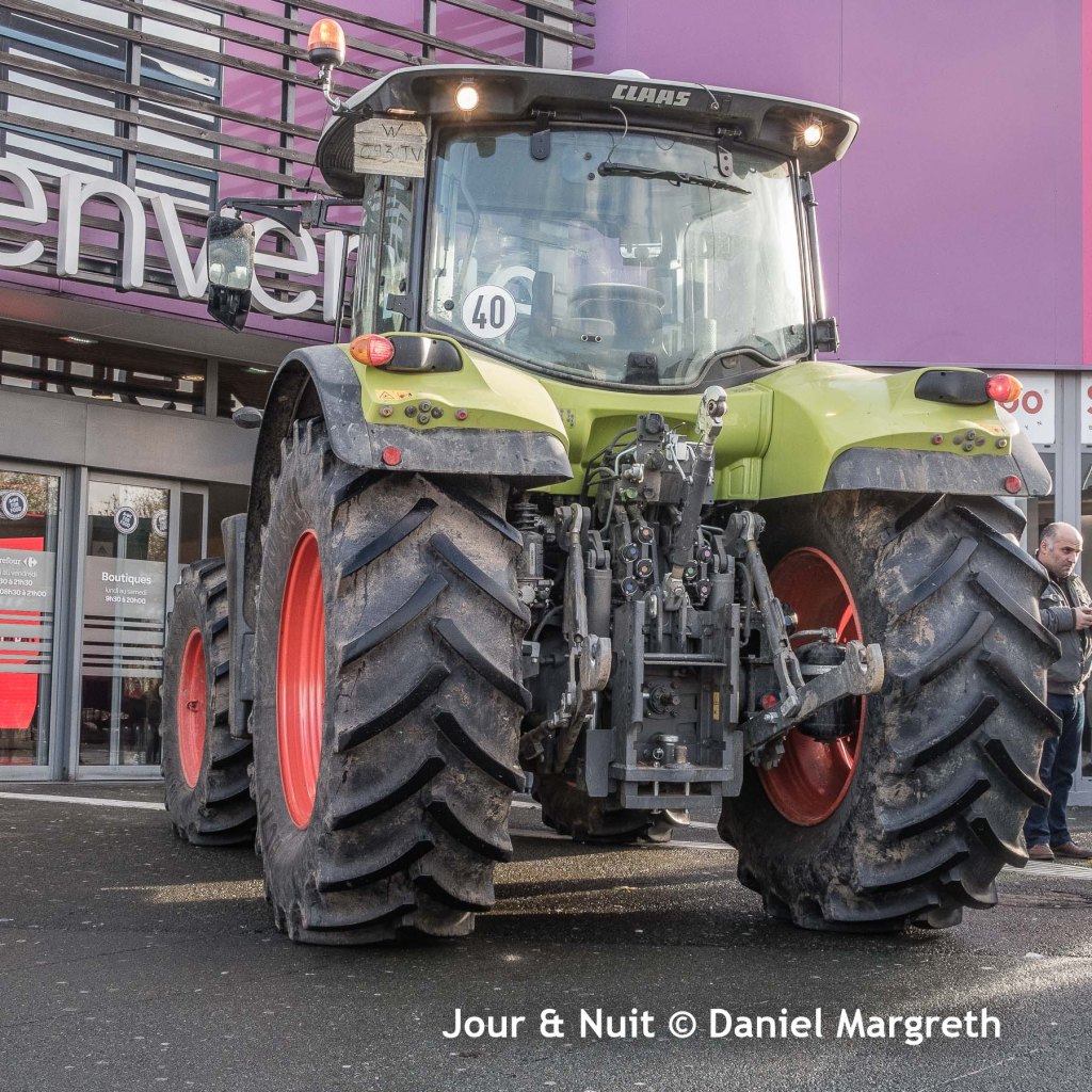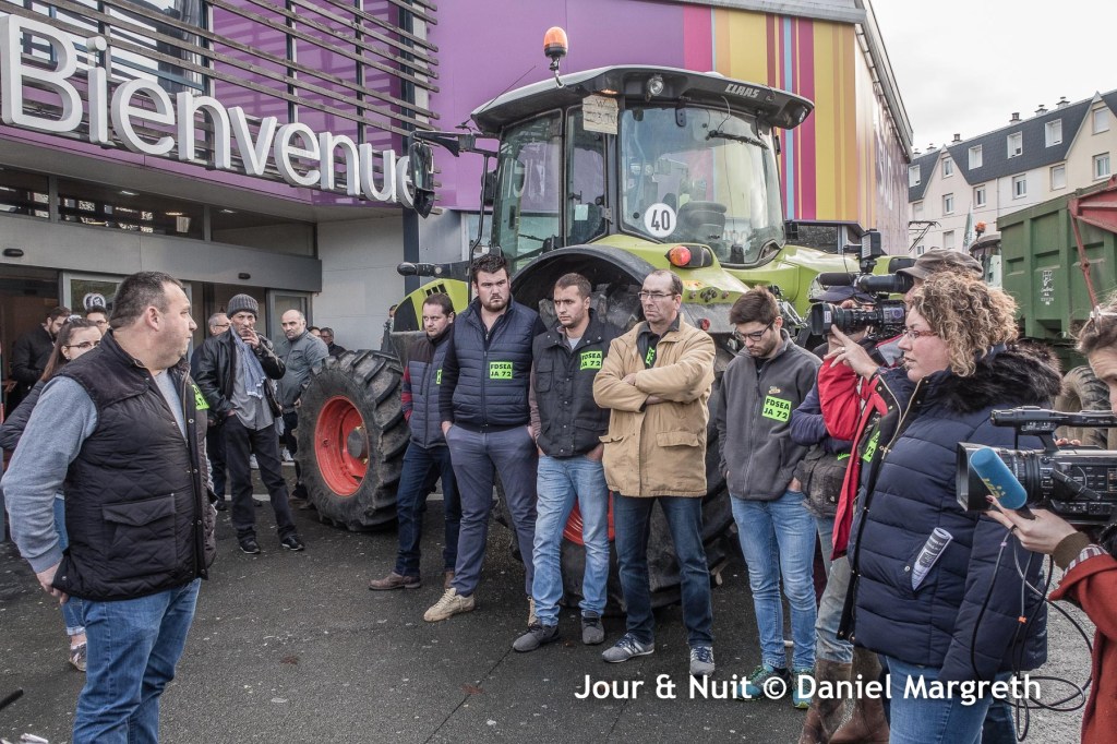 Ils étaient donc une trentaine d’agriculteurs présents dont 4 avec leurs tracteurs devant l’entée du magasin Carrefour. Ils nous ont expliqué le sens de leur action : dénoncer le non respect ou le détournement de la loi Egalim sur les promotions, et notamment le fameux « 1 produit acheté = 1 produit gratuit », ainsi que contrôler l’origine des produits dans les rayons.