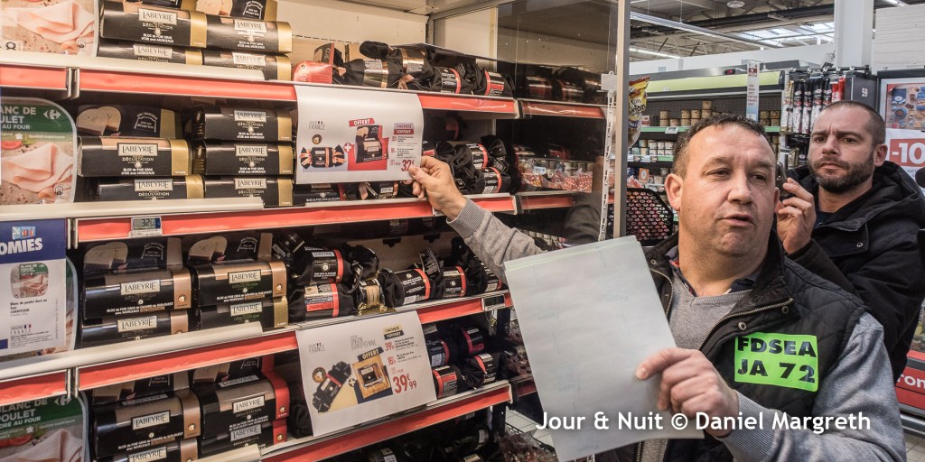 Une fois devant les rayons, les agriculteurs ont pu constater la présence de promotions « qui détournent l’esprit de la loi Egalim » avec notamment « 1 produit acheté = 1 produit gratuit » sur des foies gras : le gratuit n’étant pas exactement comme celui acheté , c’est conforme à la loi! Belle démonstration de détournement légal ! Ensuite pour beaucoup de produits de charcuterie qui n’indiquaient pas clairement l’origine des produits, une étiquette a été apposée sur l’emballage pour attirer l’œil du consommateurs ! Une opération d’information des clients.