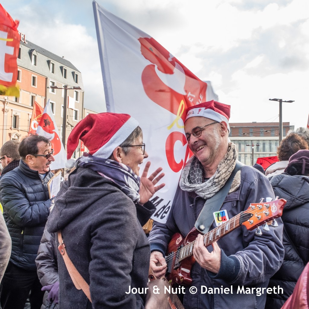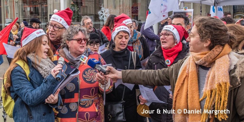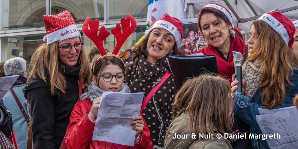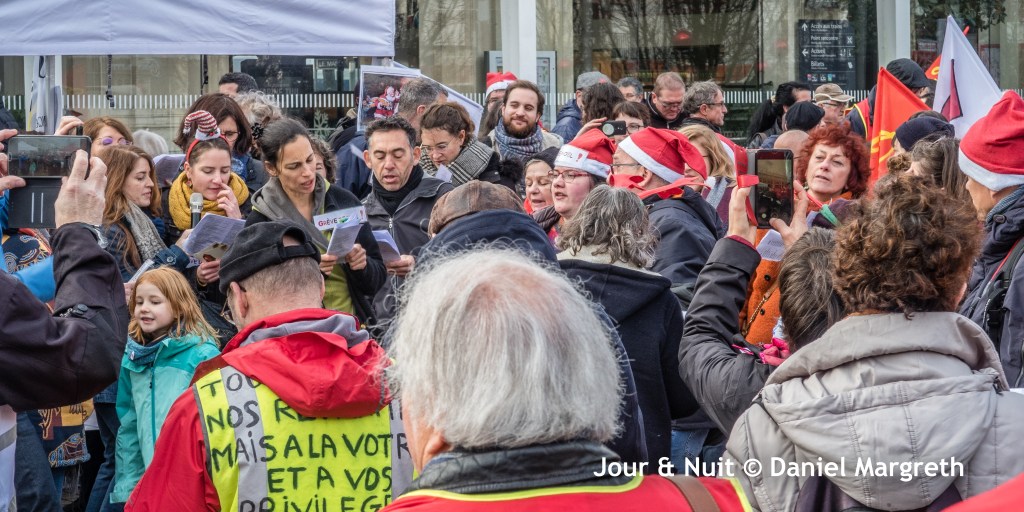 Sur le parvis de la gare, ce sont les chants, la musique et les visages souriants qui répondent au mépris: c’est la « grève de Noël »! Pastichant les chants traditionnels, les 300 manifestants ont donc chantés et dansés, heureux de se retrouver pour partager un peu de plaisir en trinquant avec un verre de vin chaud ou en dégustant une assiette d’huître et son verre de vin blanc.