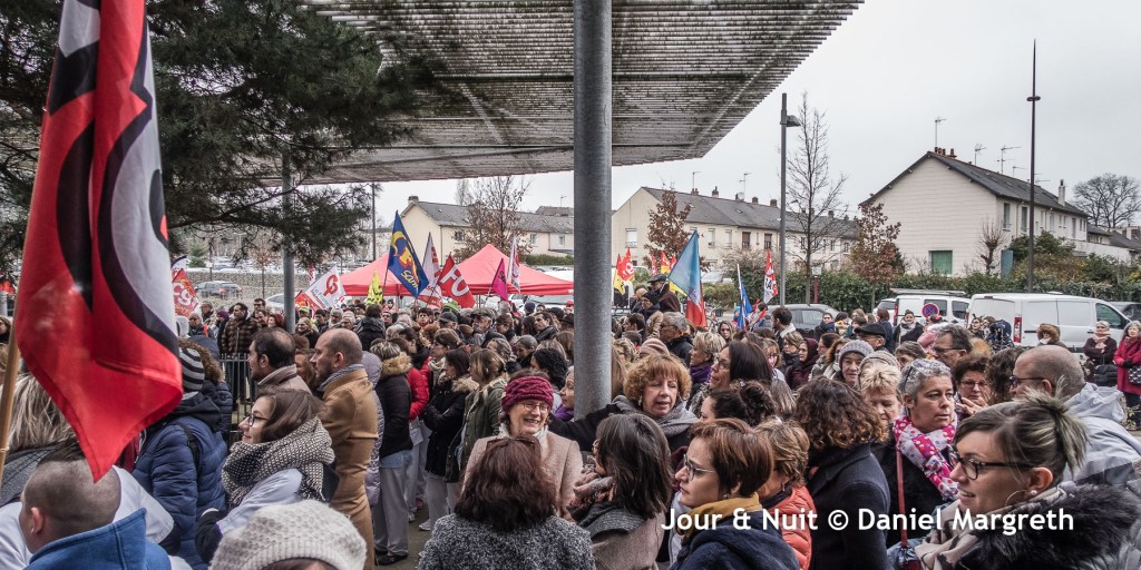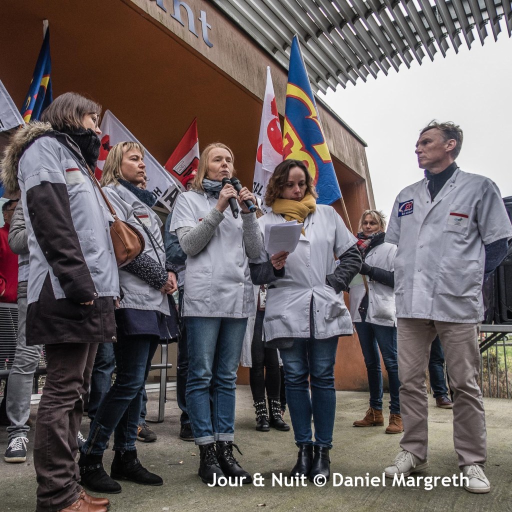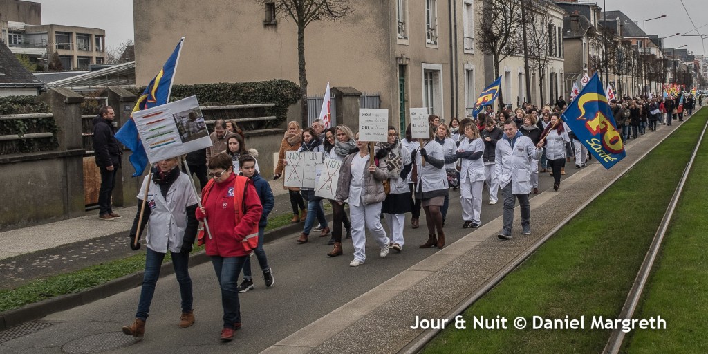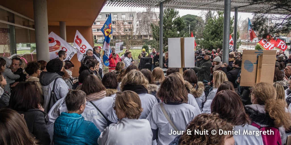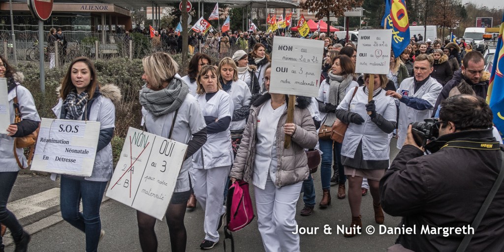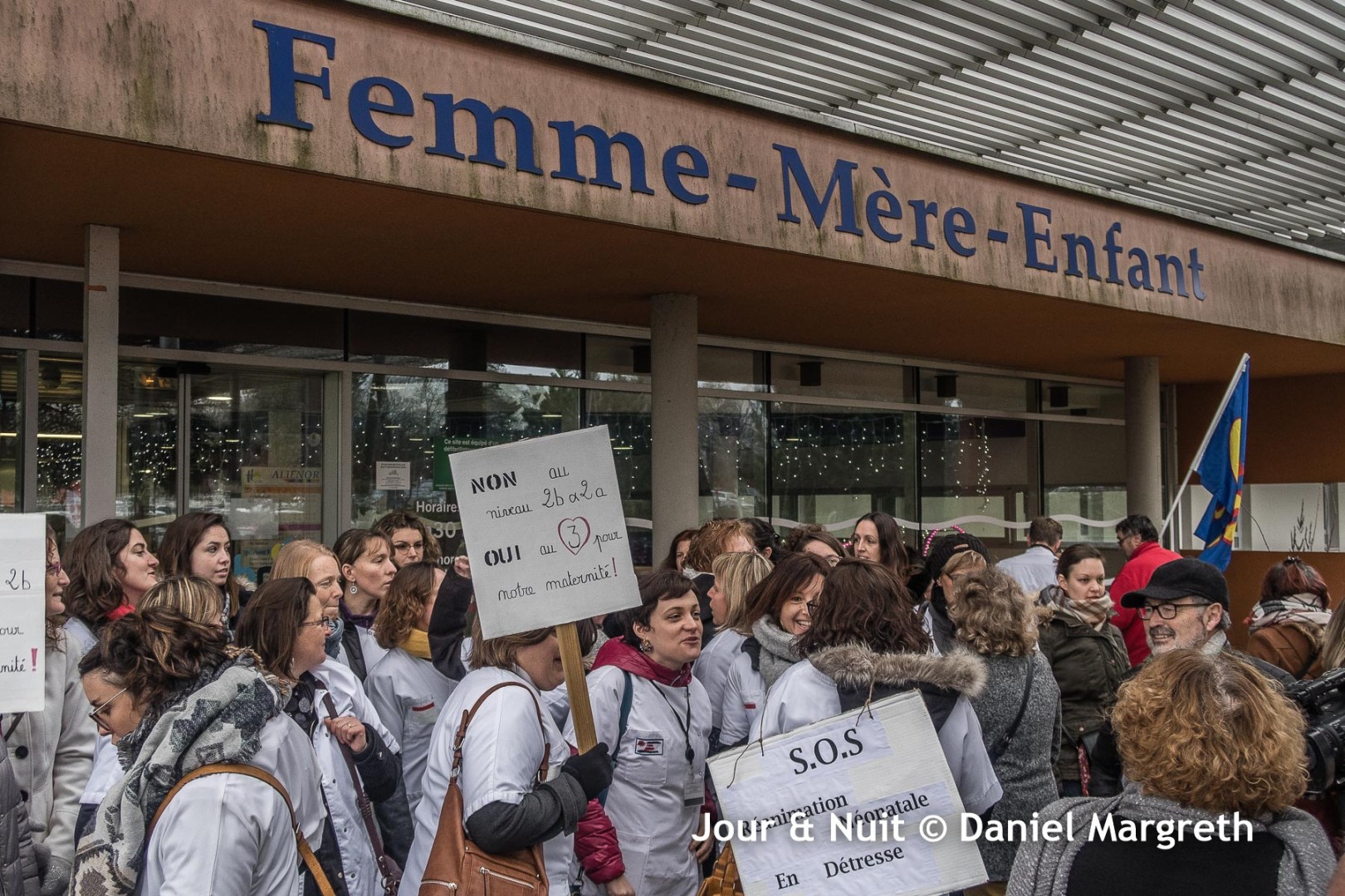 Suite aux prises de paroles des syndicats et des professionnels ainsi que des usagers tout le monde présent devant l’entrée du pôle Femme-Mère-Enfant est parti en manifestation jusqu’aux bureaux de la direction du CHM par la route de Degré et l’avenue Rubillard.