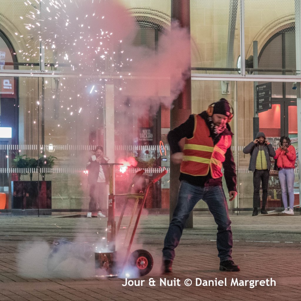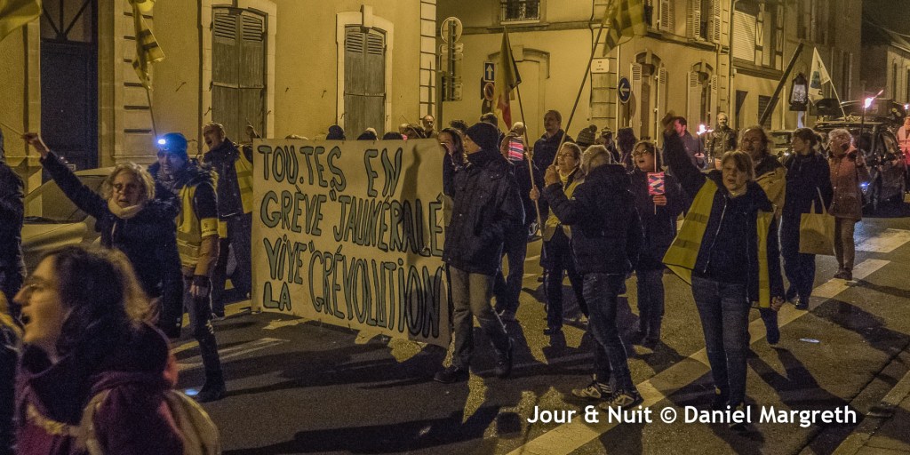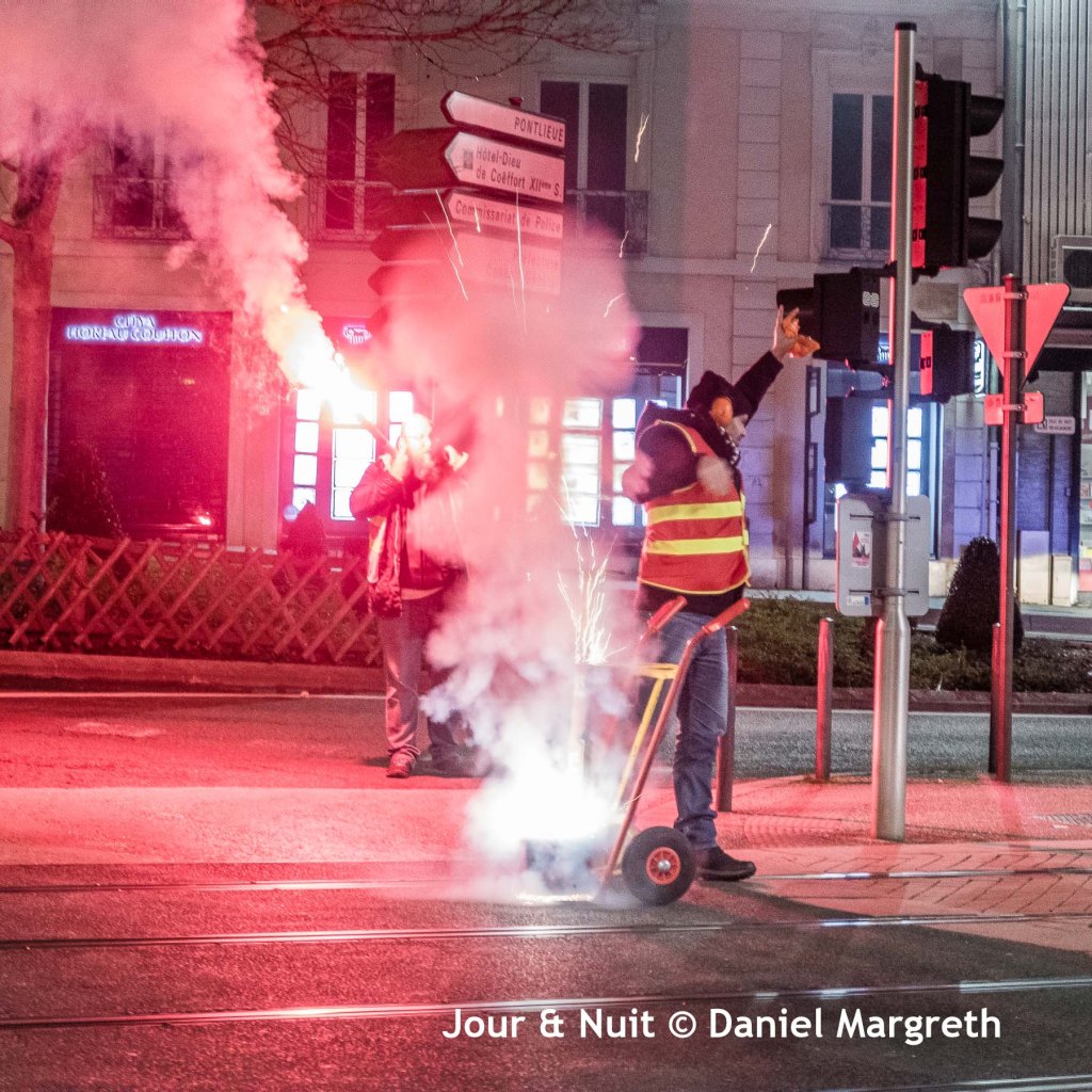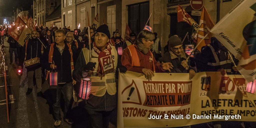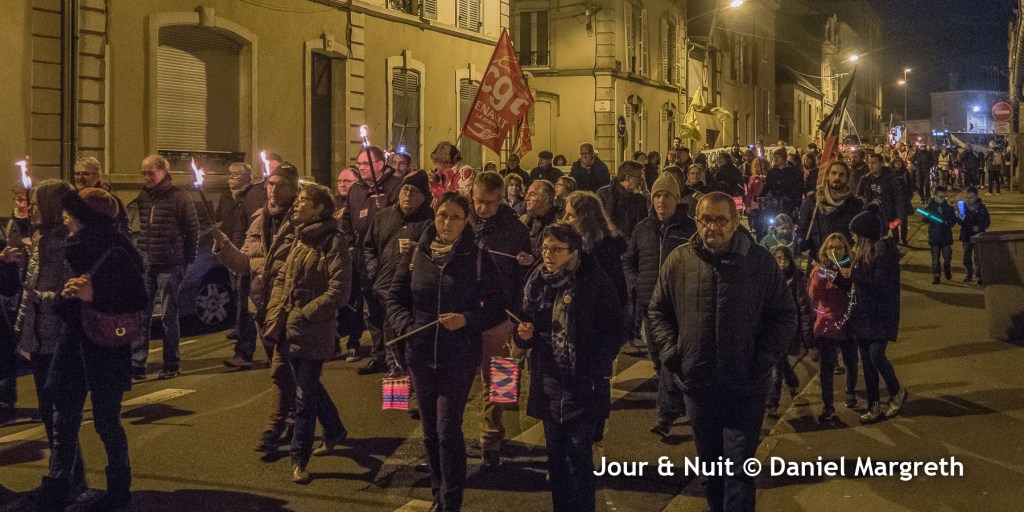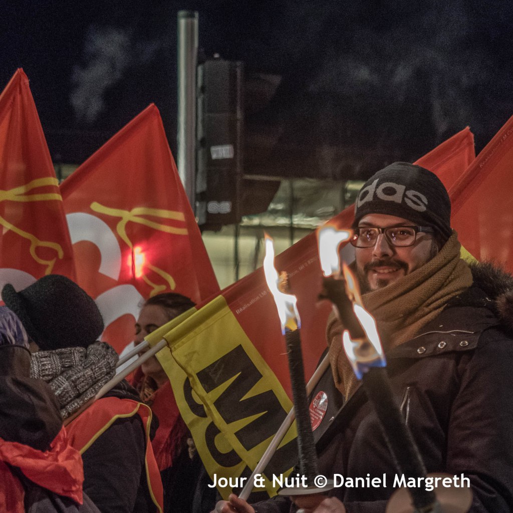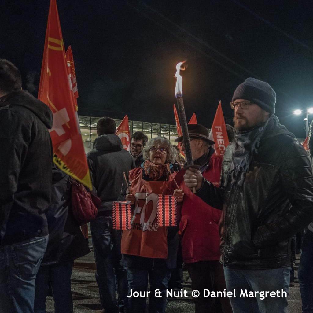 A 18h00, le cortège quitta l’esplanade du Palais des Congrès où les syndicats avaient installé leurs barnums… C’est donc dans une joyeuse ambiance familiale mais revendicative que plus de 500 manifestants munis de leurs flambeaux et lampions ont déambulé dans les rues de la ville… Au rythme des explosions des « bombes » des cheminots et des chants et slogans réclamant le retrait de la réforme, le cortège a fini son chemin devant les barnums syndicaux où l’attendait le vin chaud et l’animation musicale autour des revendications, histoire de se réchauffer le corps et le moral en toute fraternité!