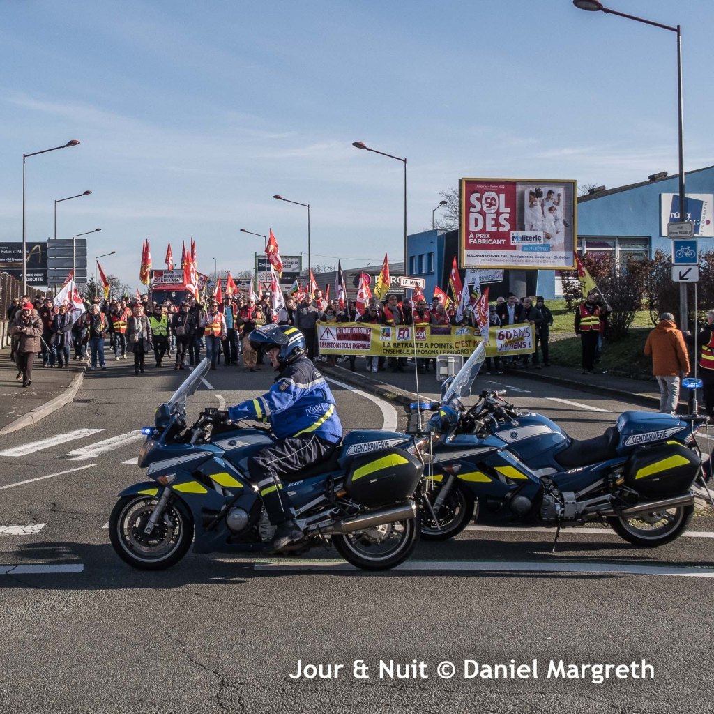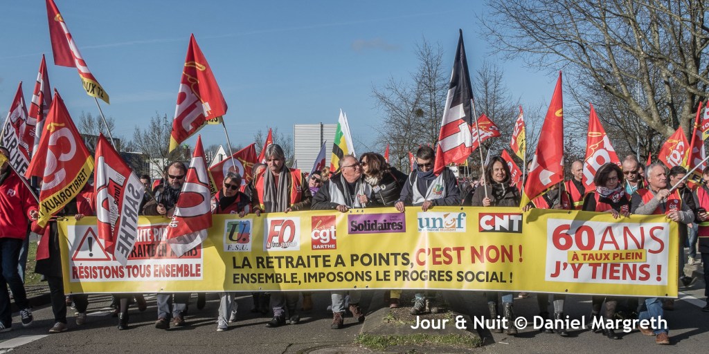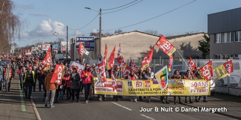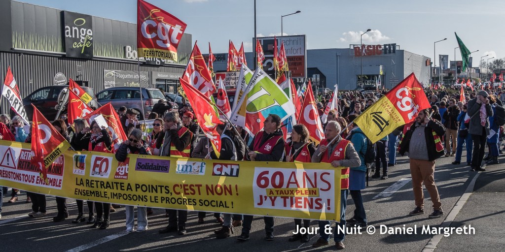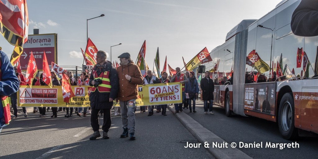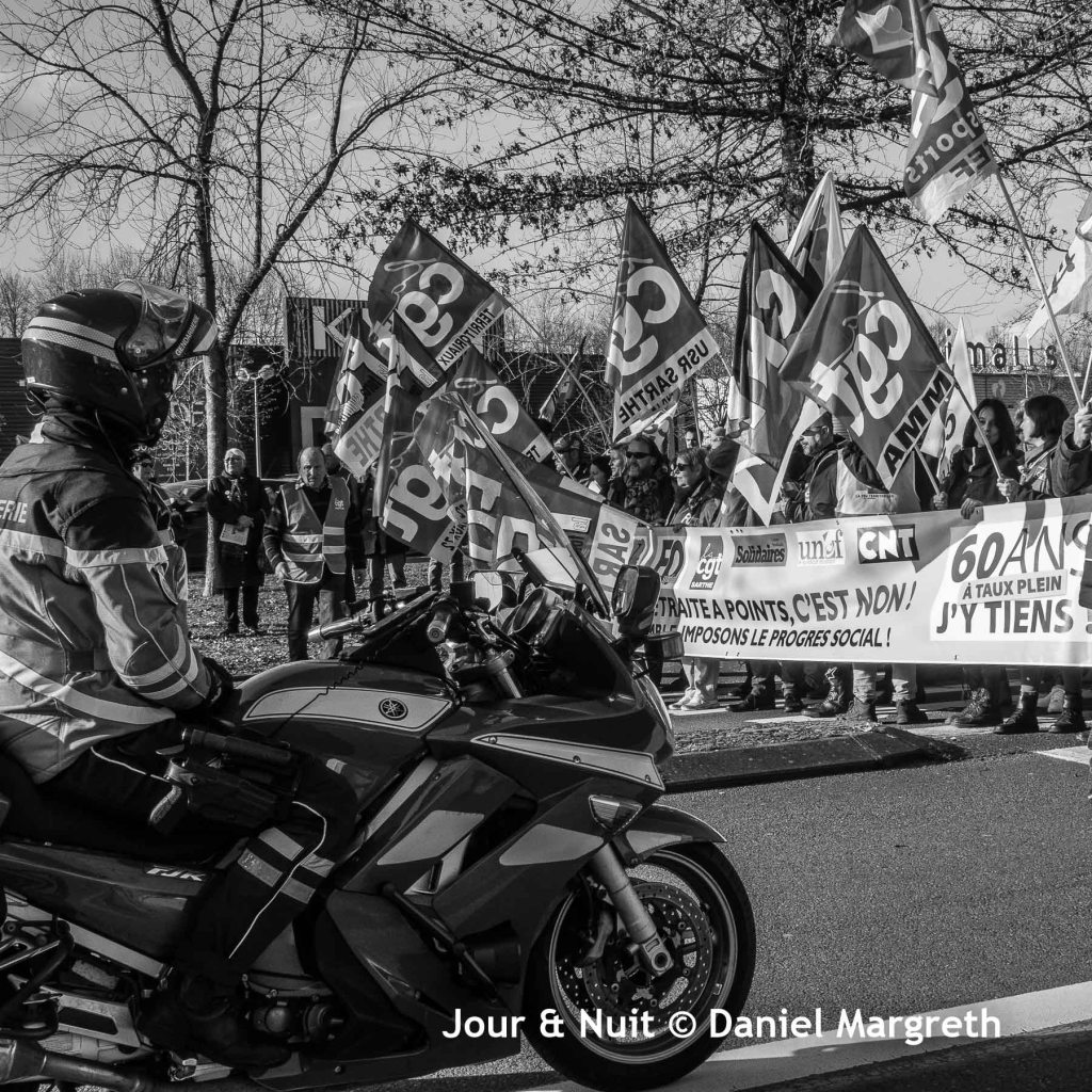 Ce samedi 18 janvier 2020 au Mans, 45ème jour de la grève, il faisait un superbe soleil et une température fraîche mais c’était sans compter sur les manifestants contre la réforme des retraites qui allaient réchauffer l’atmosphère depuis le début d’après-midi en zone commerciale nord jusqu’à la cérémonie des vœux et la galette du député LREM Damien Pichereau!