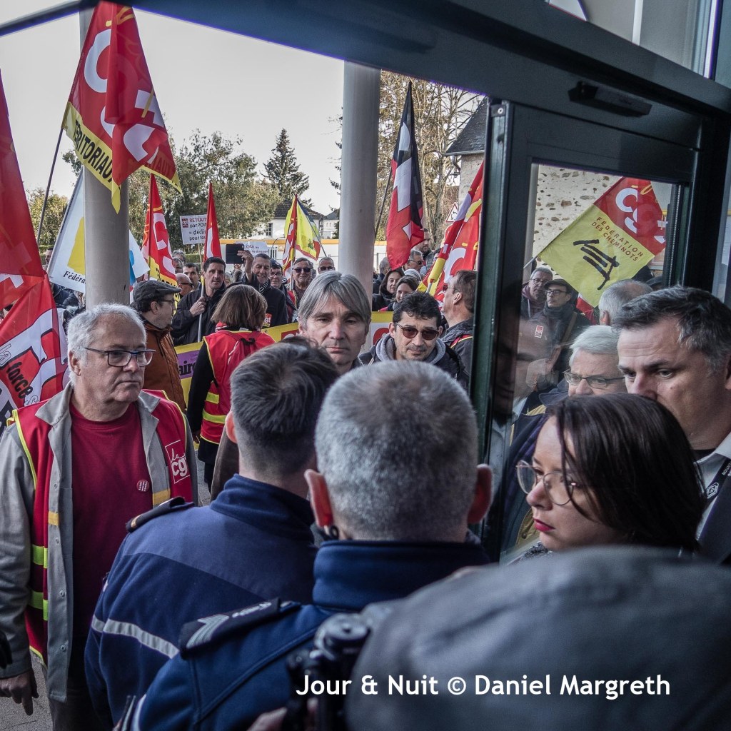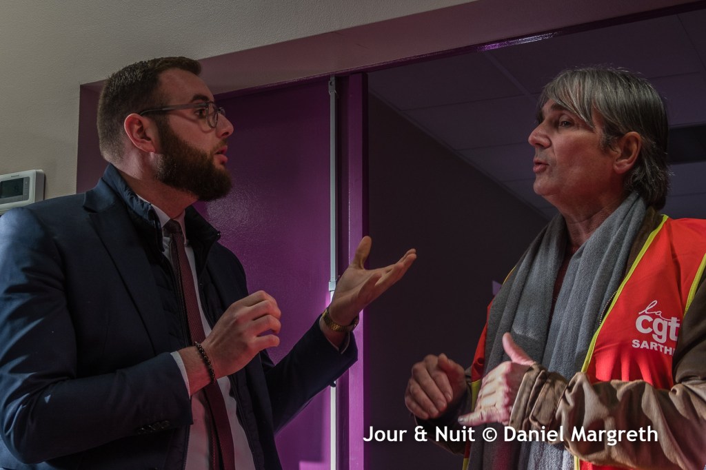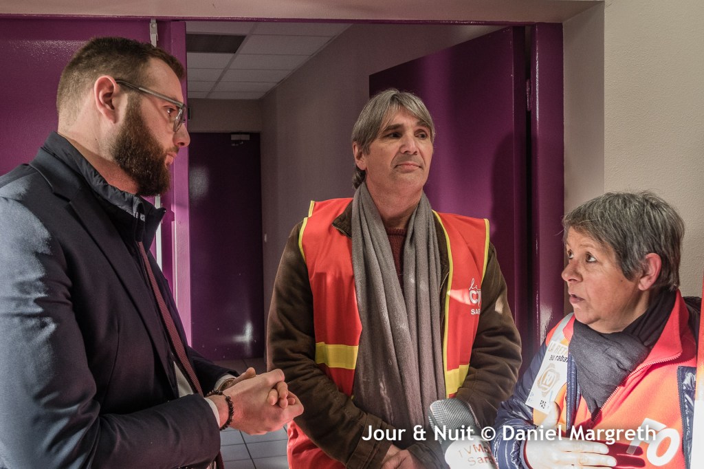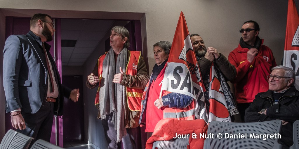 Sur place la Gendarmerie sécurisait les lieux… L’intersyndicale a demandé à être reçu en délégation par le député qui a accepté qu’elle entre dans la salle. Les syndicats l’ont alors invité à venir dialoguer avec les manifestants afin d’entendre leur désaccord sur le projet de loi mais le député ne voulait pas répondre sous la pression… Rapidement la conversation devint un dialogue de sourds pendant que les invités dégustaient la galette des rois mais nous n’avons pas pu y goûter…