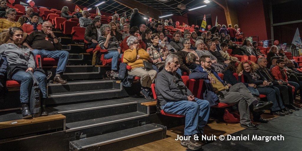 Après un moment chaleureux de rencontre entre tous qui est toujours un instant de bonheur partagé un verre à la main au bar de la salle, tout le monde se dirige vers les longues tables installées derrière les gradins pour un repas préparé par les grévistes et pris en commun: les discussions continuent sur la suite du mouvement et la situation dans leurs entreprises respectives…