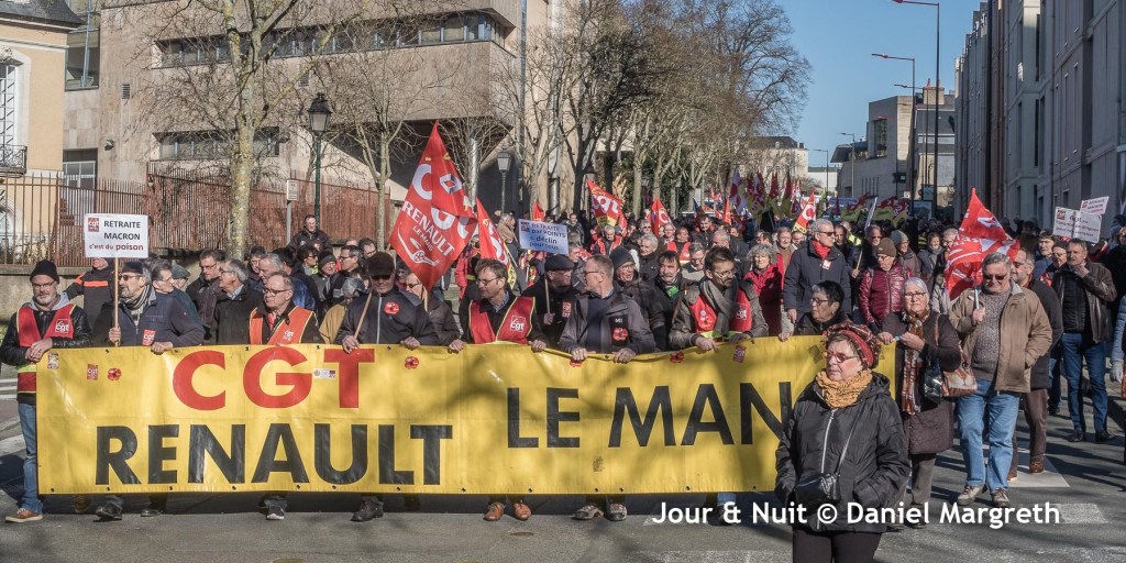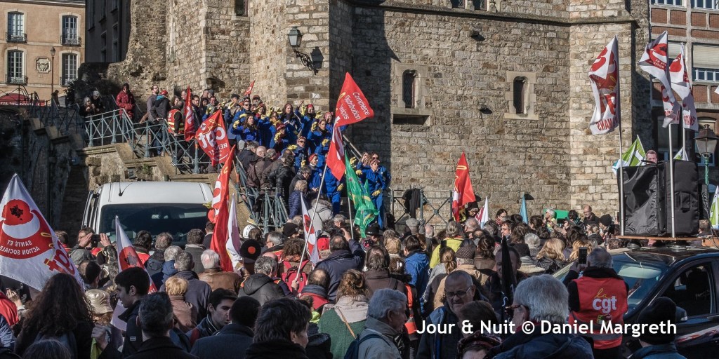Les Rosies intallées sur les marches ont animé le rassemblement avant le départ de la manifestation à 14h00. Le cortège est parti vers la place de l’Eperon et accueillait en plus des entreprises habituelles des élèves des lycées Marguerite Yourcenar et Bellevue du Mans actuellement en lutte contre les épreuves E3C du nouveau bac Blanquer ainsi que des étudiants de l’Université du Mans également en lutte. En plus des syndicats CGT, FO, FSU, Solidaires, CNT on pouvait apercevoir des gilets jaunes derrière leur propre banderole…