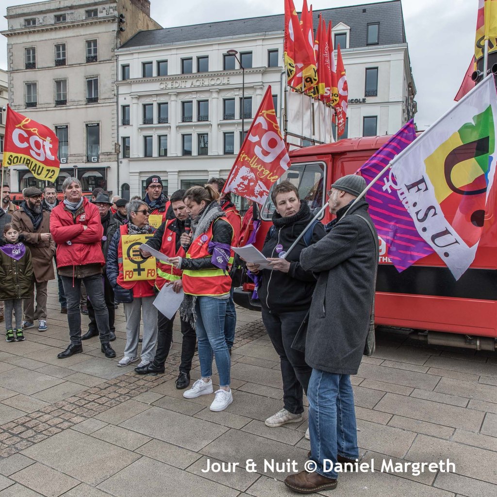 Ce sont donc les femmes qui étaient en tête du cortège de plus de 500 manifestants majoritairement composé de femmes après une prise de parole, place de la République, rappelant le sens de cette journée de lutte. Les Rosies sarthoises avaient pour l’occasion une nouvelle chorégraphie qui fut fort applaudie.