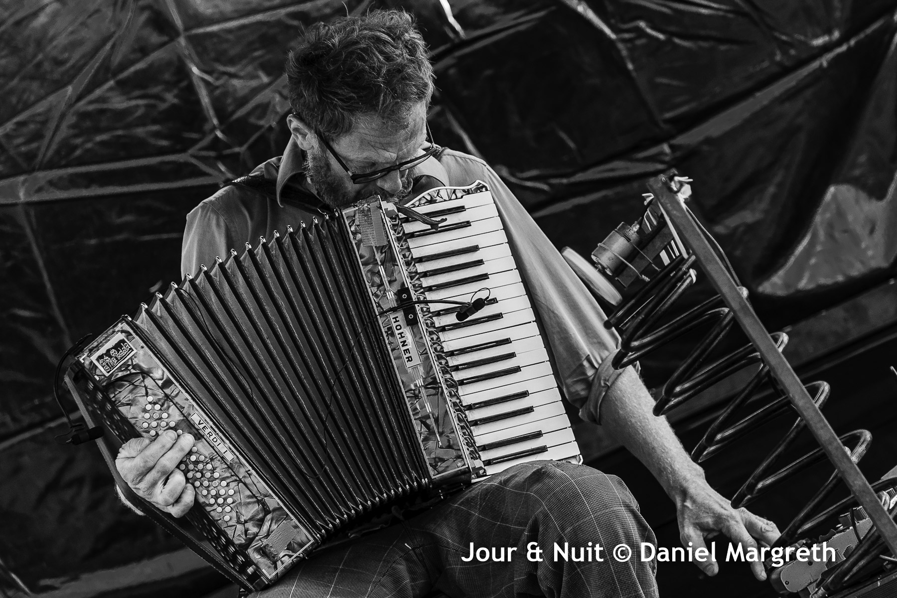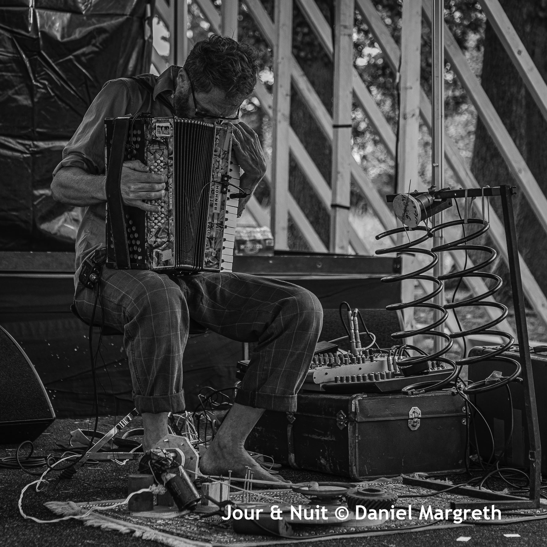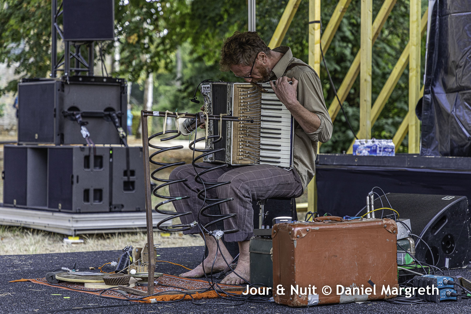 L’accordéon, il joue ça avec une pédale de delay accompagné de ressorts et de bidouilles pour rythmer sa mélodie.
