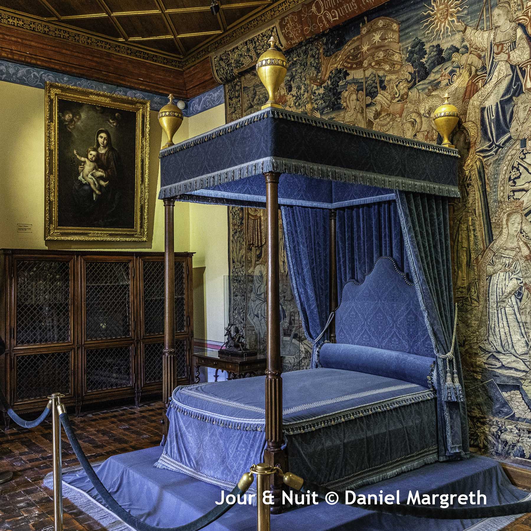 Le lit à baldaquin est de style Renaissance. La cheminée de Jean Goujon, sculpteur de l’Ecole de Fontainebleau porte les initiales du Roi Henri II et de Catherine de Médicis: le H et le C qui, entrelacés forment le D de Diane de Poitiers…