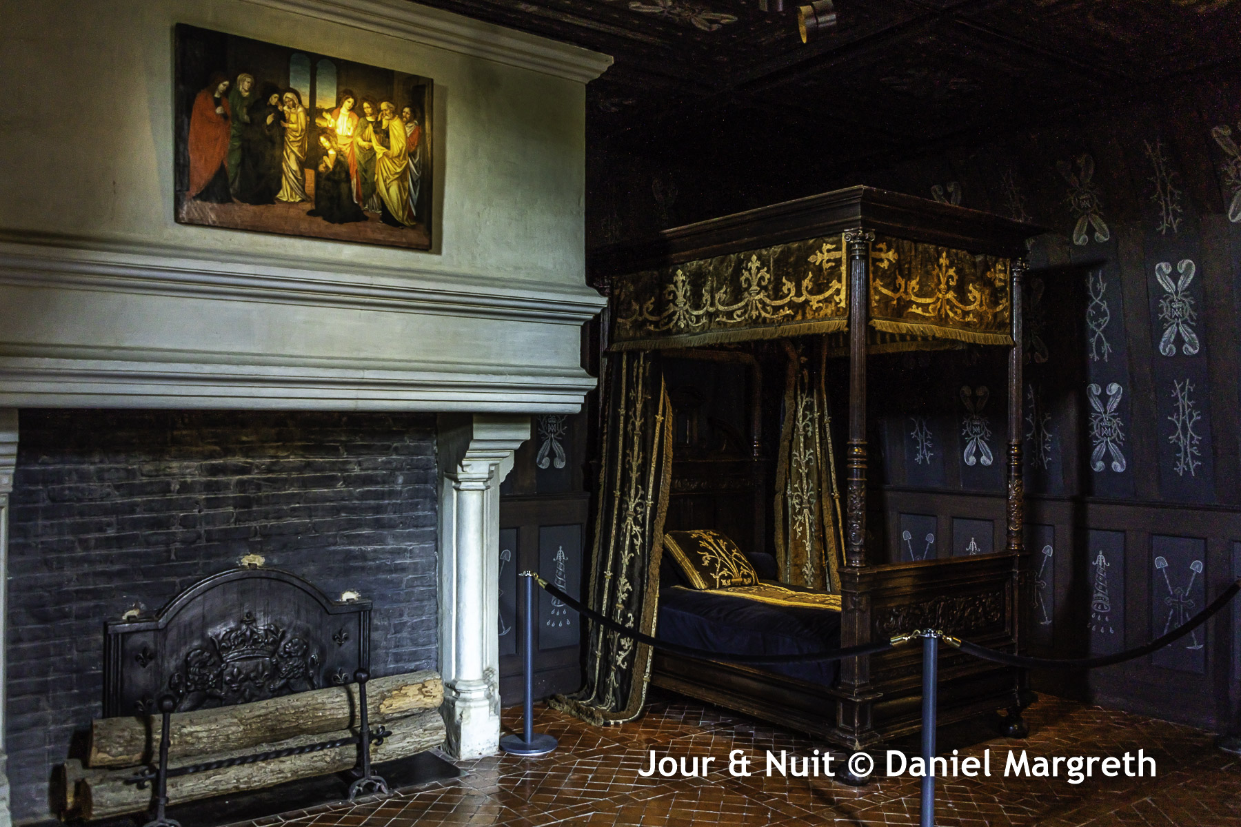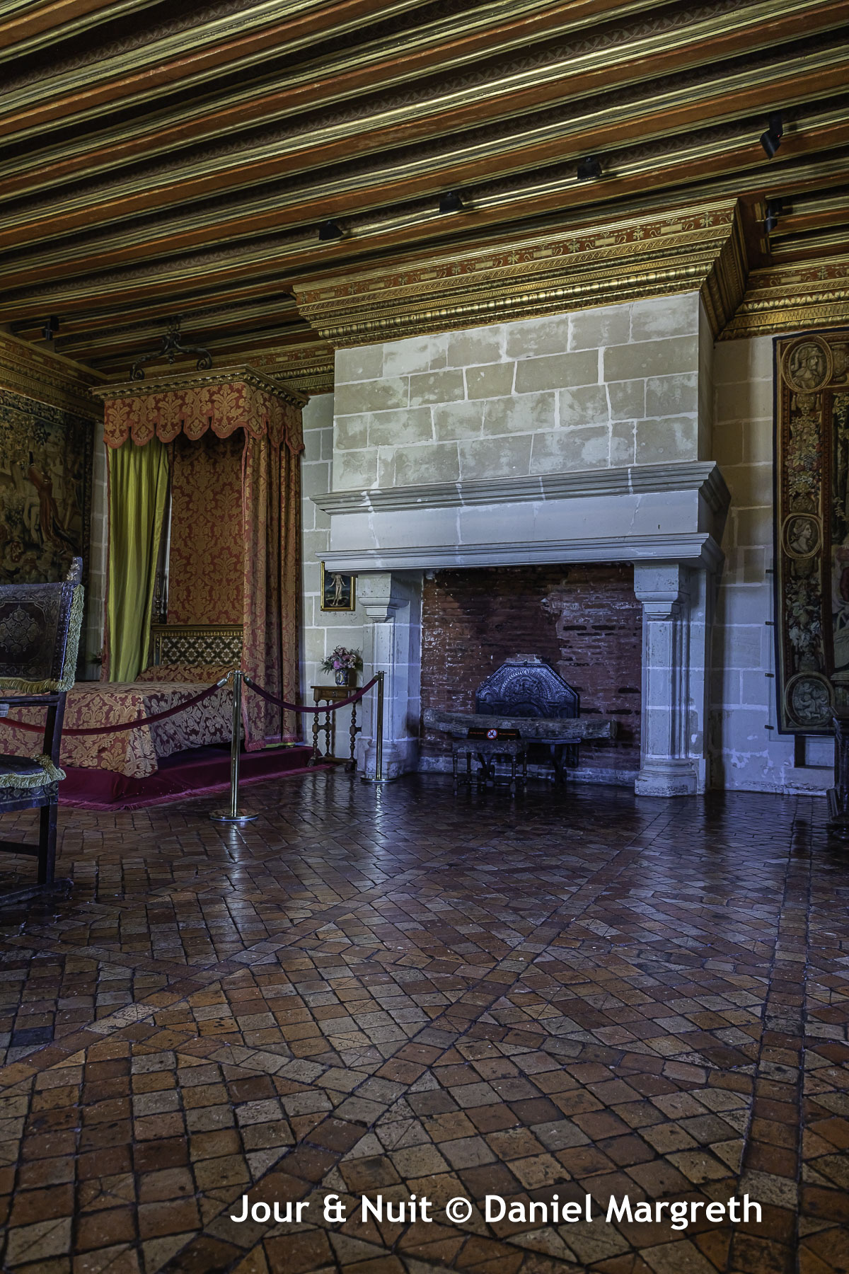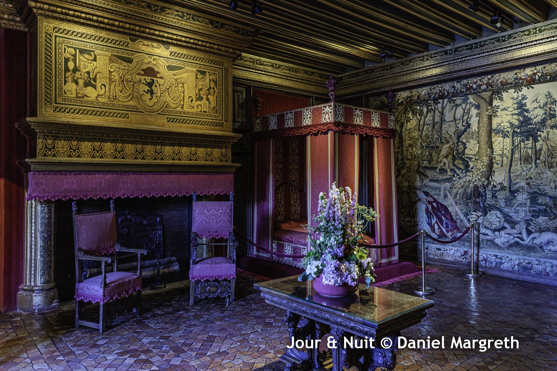 Le plafond de cette chambre est en bois à caissons carrés, peints et dorés. Le lit à baldaquin est Renaissance et orné de frises, pilastres et de portraits inspirés des médailles antiques. A droite du lit, une peinture sur bois par Le Corrège représente ‘L’Education de l’Amour ». La cheminée et le sol sont également Renaissance. Les murs sont couverts d’un ensemble remarquable de tapisseries des Flandres du XVI ème siècle: les bordures peuplés d’animaux symbolisent des proverbes et des fables…