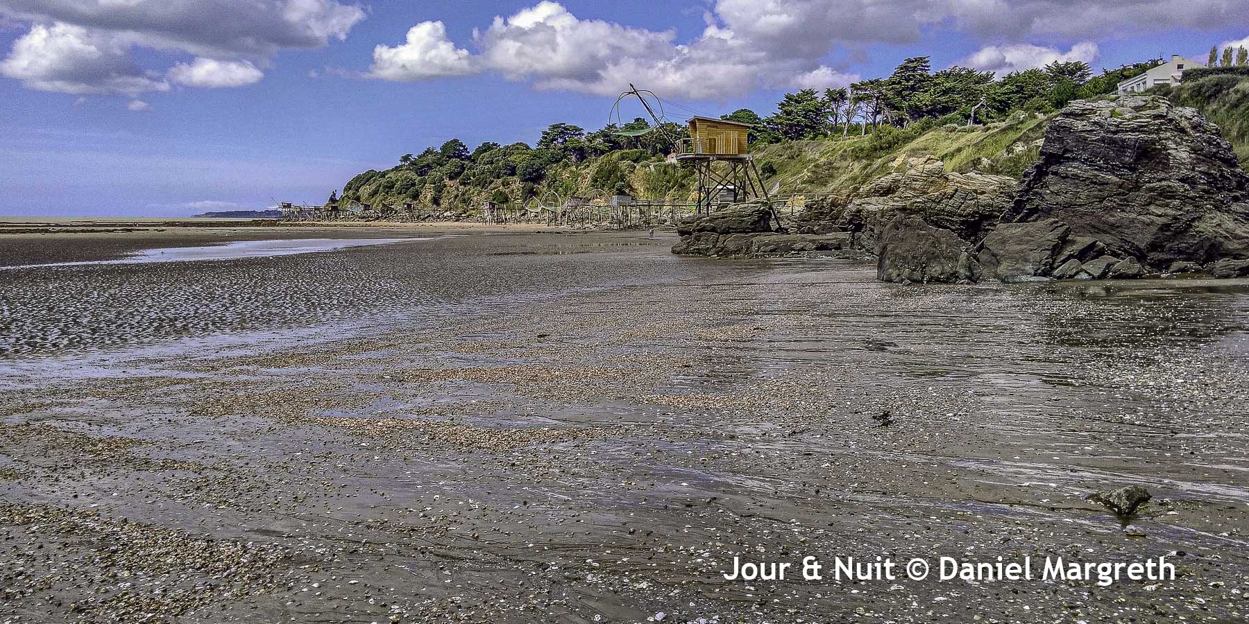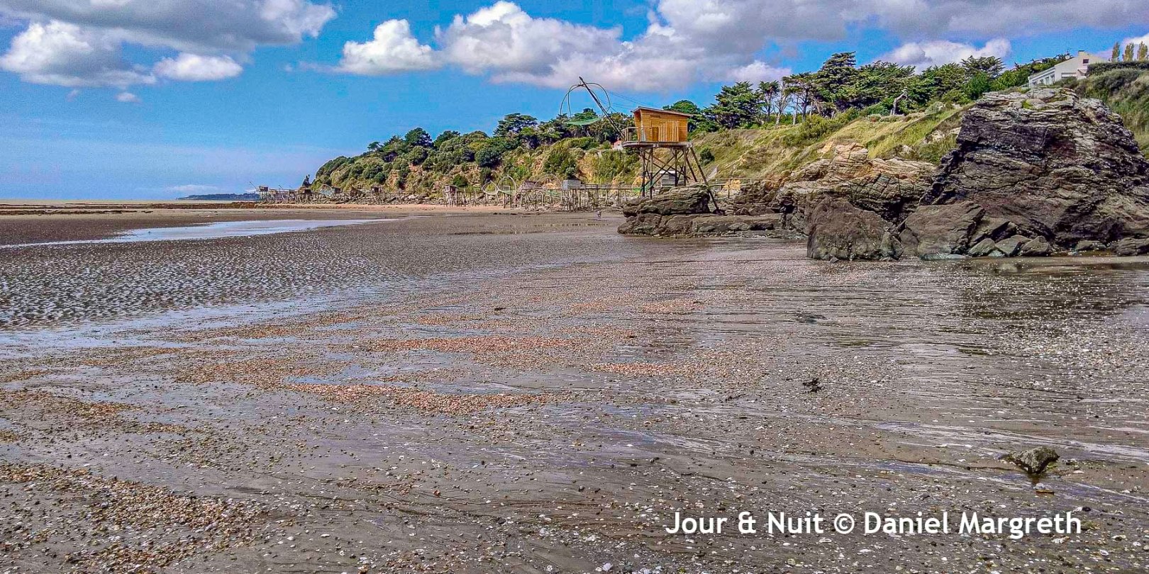 J’adore me balader sur l’estran, ce paysage maritime éphémère et renouvelé à chaque marée. Celui de La Bernerie-en-Retz au sud de Pornic offre, en raison de sa faible pente, un paysage varié et infini de sable fin, de coquillages, de rochers, parfois percés, de falaises escarpées et de pêcheries permettant la pêche au carrelet.