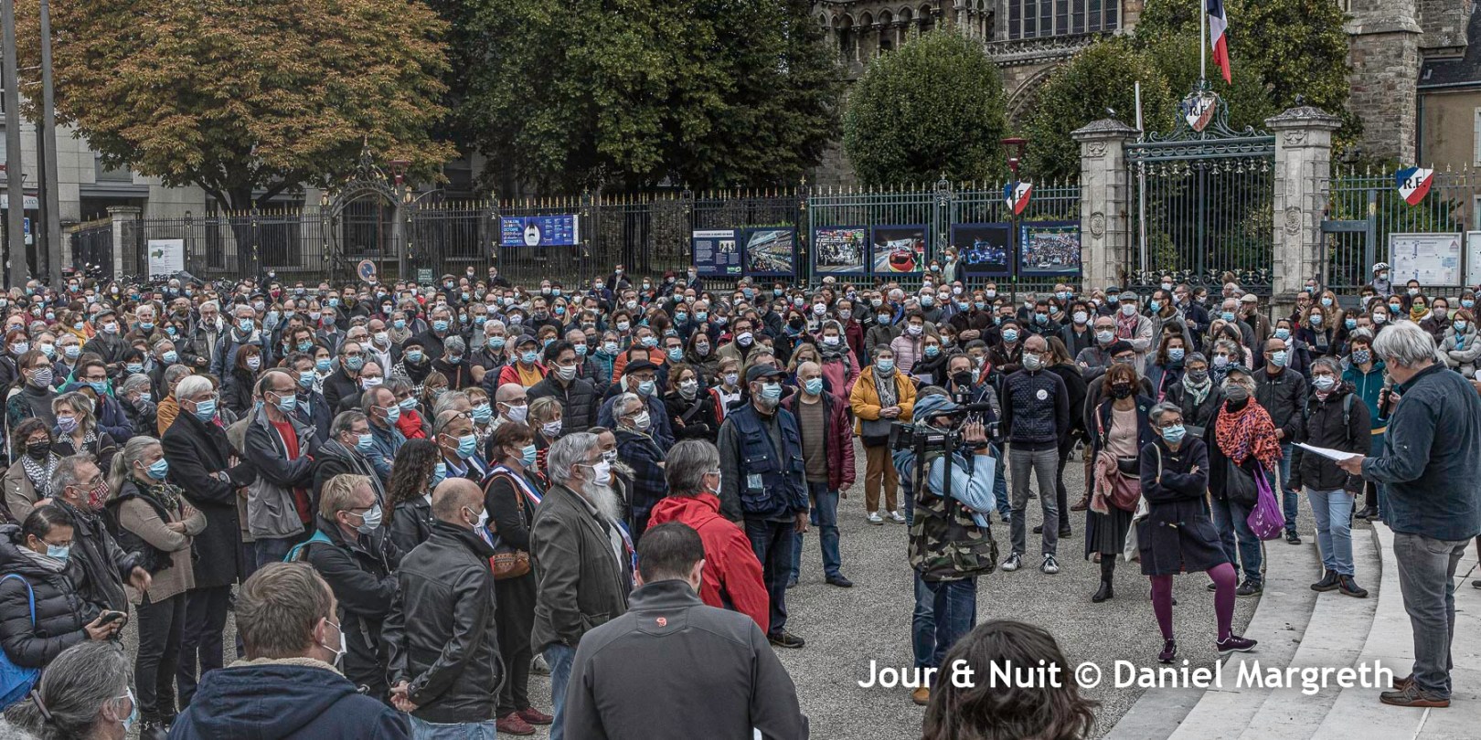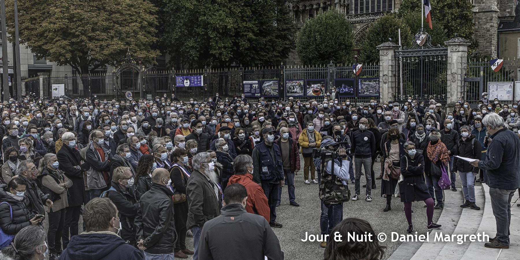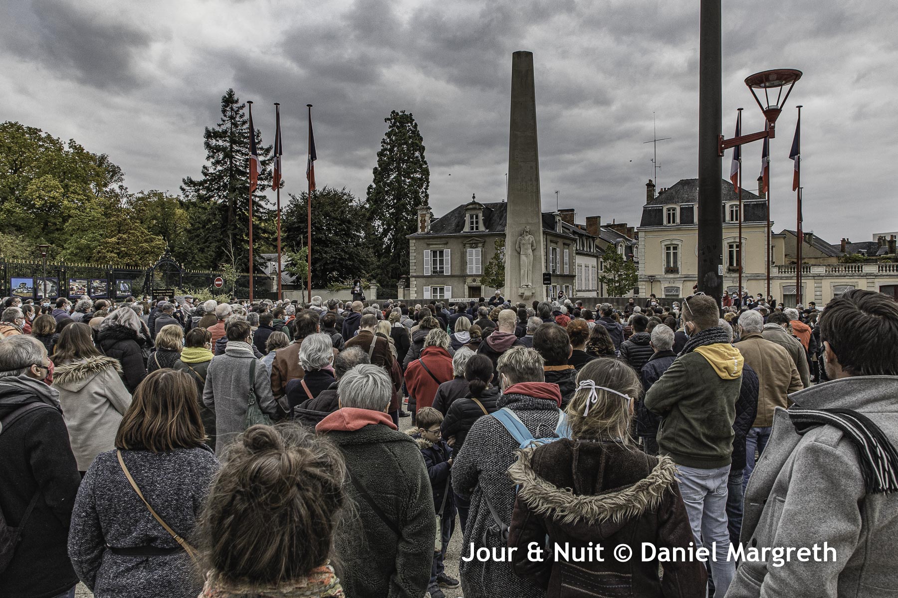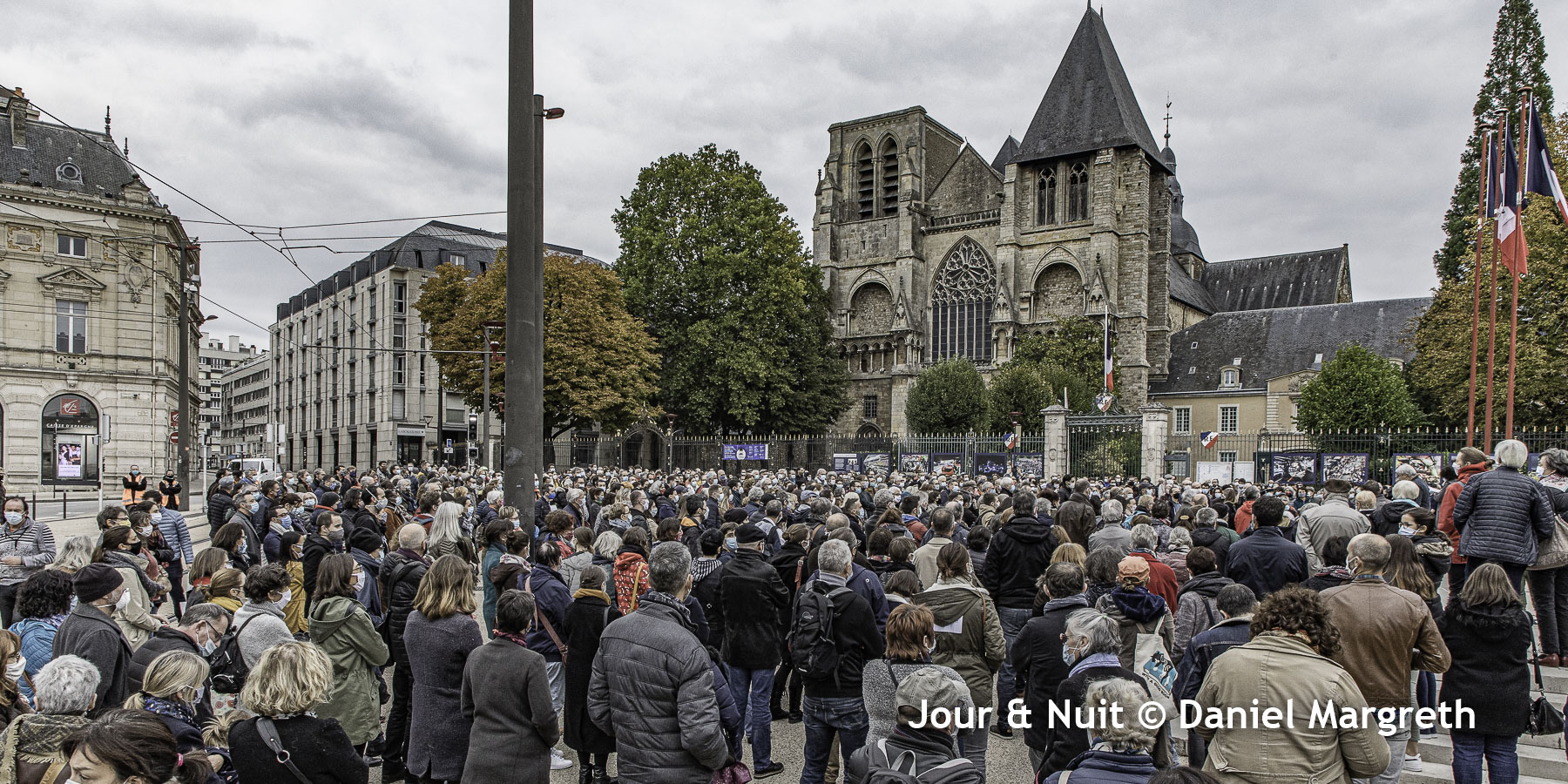 C’est plus de 800 personnes qui se sont rassemblées devant la préfecture du Mans ce samedi à 17h00 à l’appel de la FSU-Sarthe et de la CGT-Sarthe pour rendre hommage à Samuel Paty, professeur d’histoire-géographie, assassiné devant son collège pour avoir exercé son métier à Conflans-Sainte-Honorine (Yvelines).