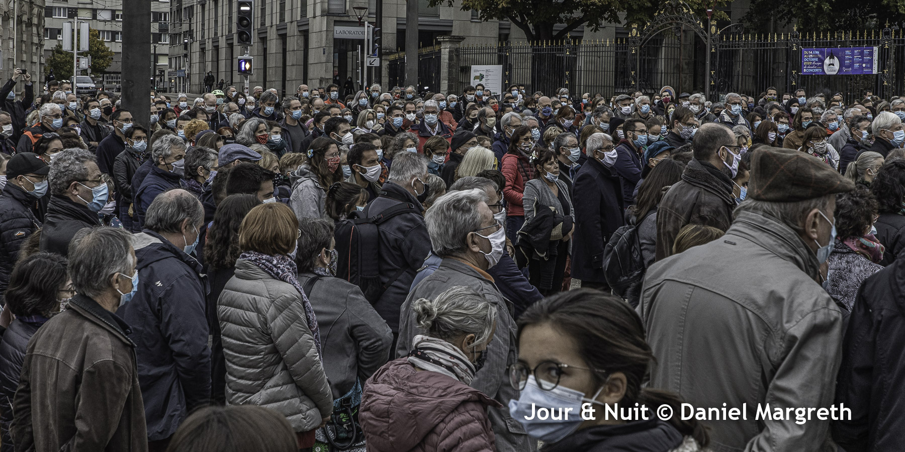 La minute de silence en hommage à Samuel Paty semblait ne pouvoir s’arrêter et les personnes présentes ont mis de longues minutes à se séparer après un impressionnant bourdonnement de chuchotements comme pour se réveiller doucement d’un cauchemar.