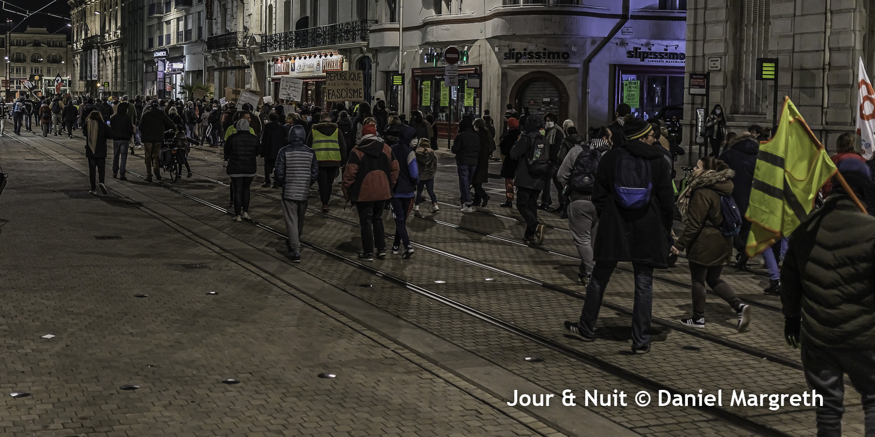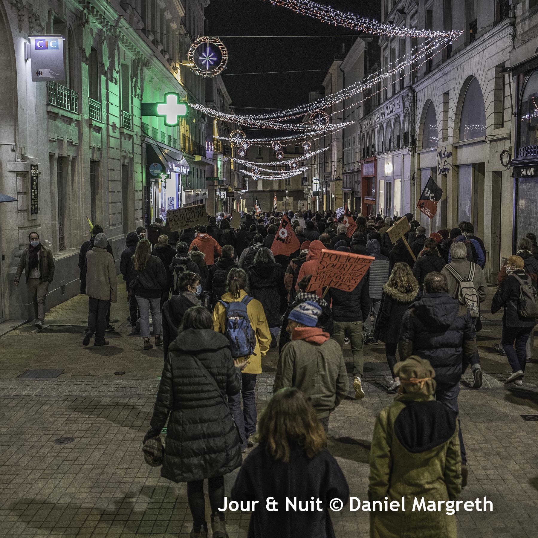 Après les prises de paroles des différentes organisations ayant appelé au rassemblement qui toutes dénoncent les atteintes aux libertés individuelles de manifester et d’informer (photo ou vidéo) des journalistes et de tous les citoyens, les participants sont partis en manifestation au travers du centre-ville pour finir devant les bureaux de la Police Municipale du Mans, place des Comtes du Maine.