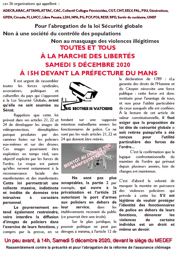 nous appelons l’ensemble des forces du mouvement citoyen et social et la population à refuser la loi sur la sécurité globale qui doit être retirée immédiatement et sans conditions !