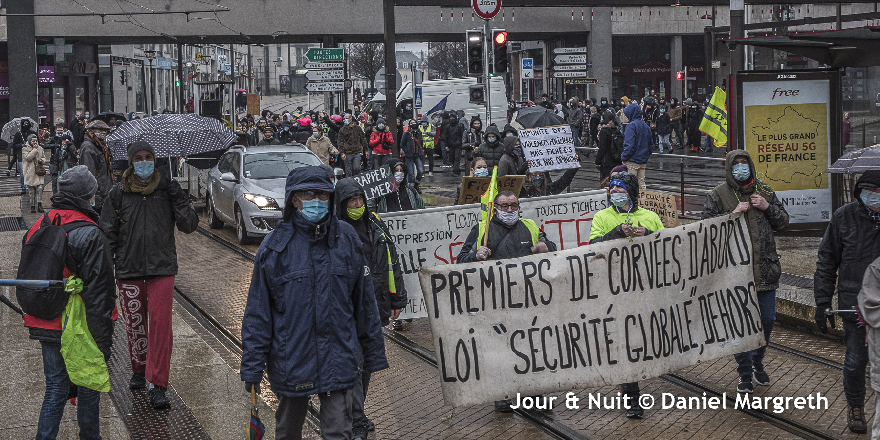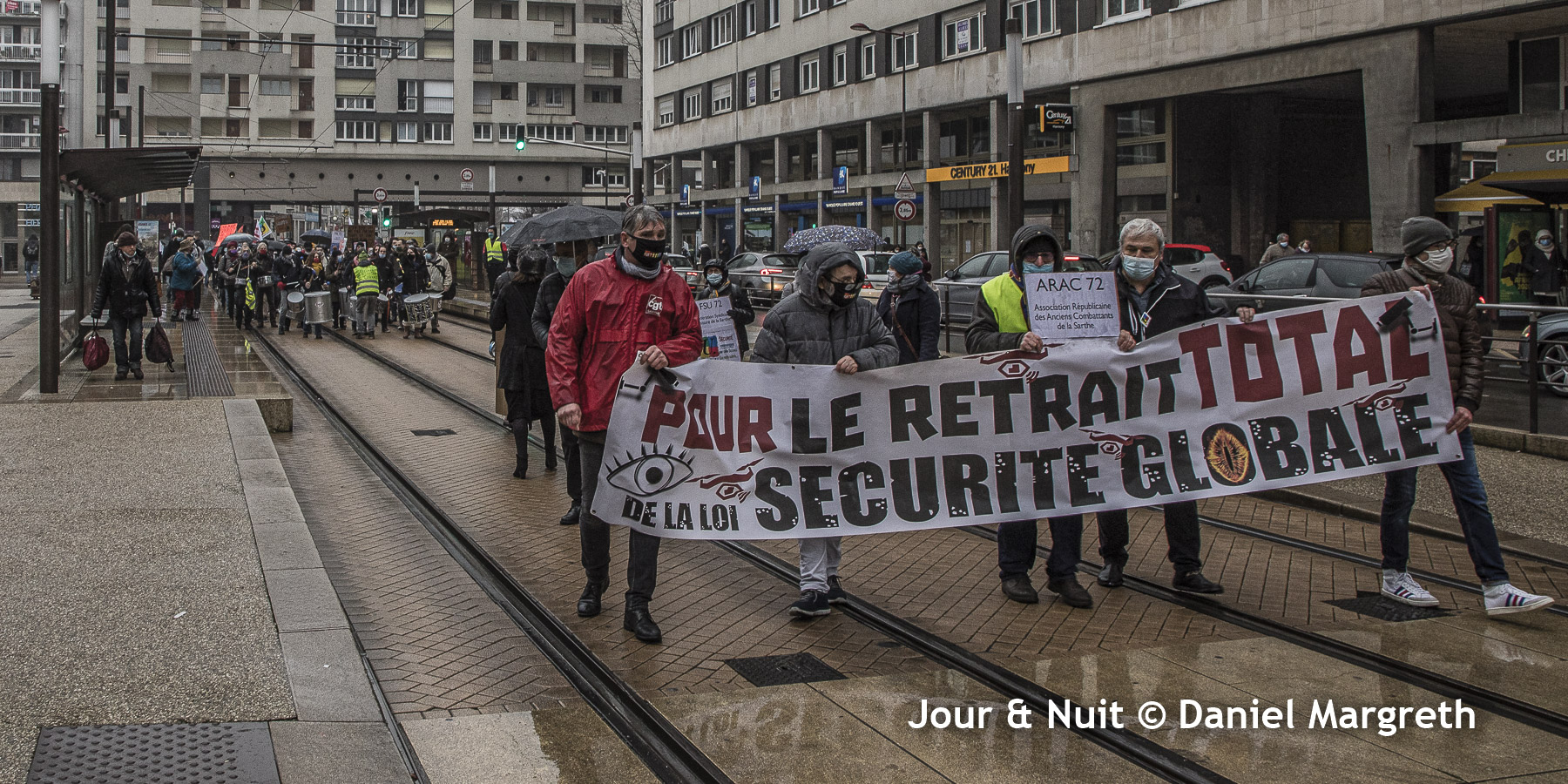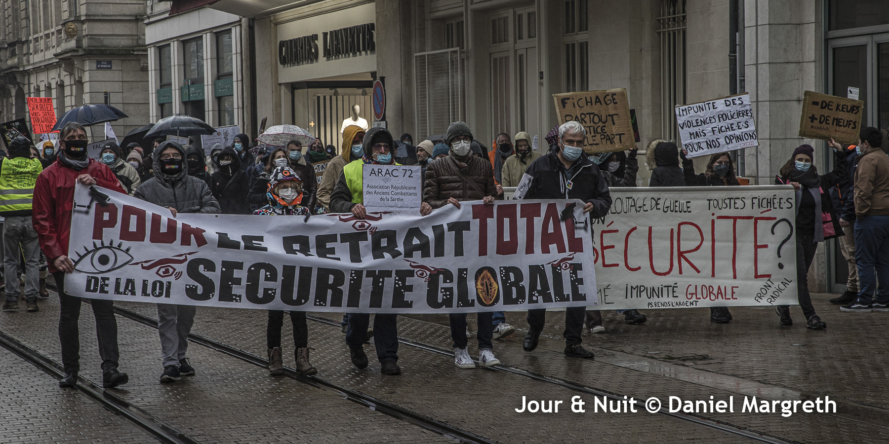 L’année 2021 commence comme a fini 2020. Ce samedi 16 janvier à partir 15h00, malgré le froid et la pluie, plus de 600 manifestants ont défilé dans le centre ville pour dire leur opposition à la loi Sécurité Globale et le fichage généralisé. La manifestation étaient appelée par une trentaine d’organisations syndicales, politiques et associatives de la Sarthe.