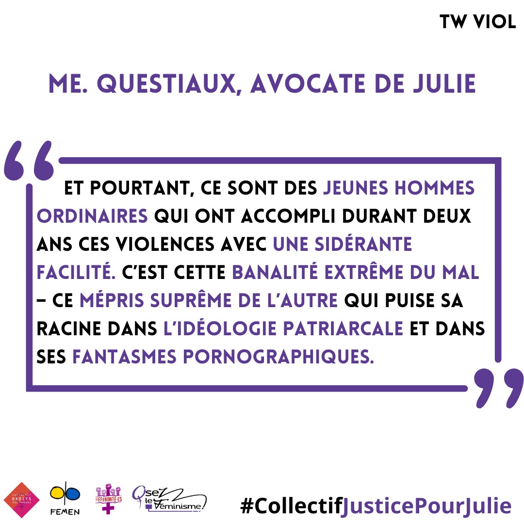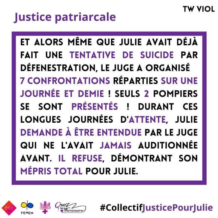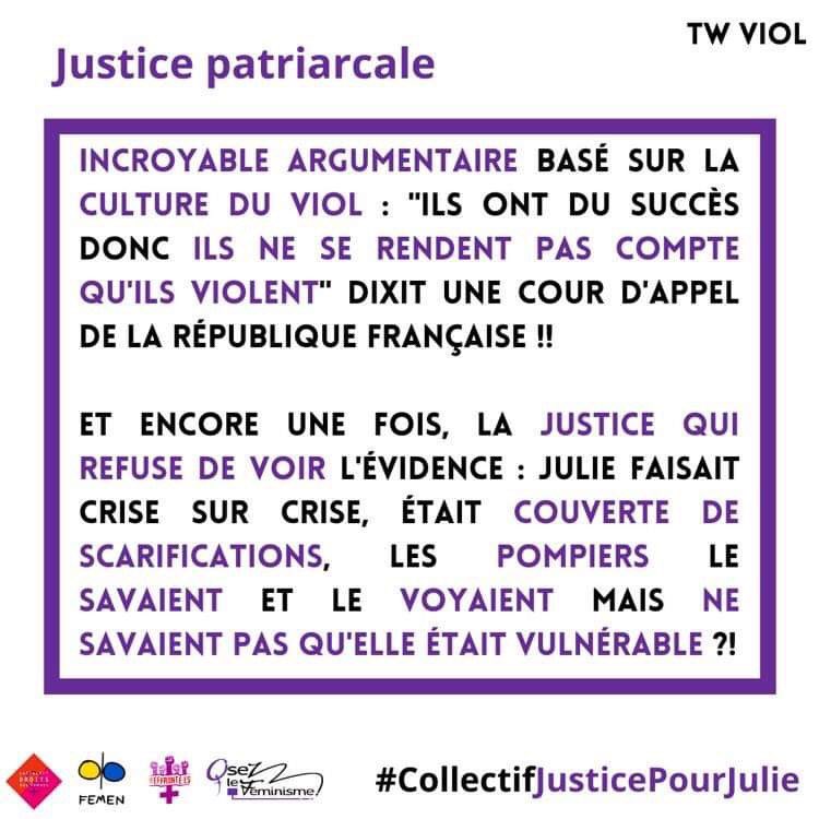 Contre cette « justice patriarcale », elles et ils exigent que « les crimes perpétrés contre elle soient reconnus et que l’impunité dont jouissent ses agresseurs soit battue en brèche » et appelaient à manifester dans toute la France le 7 février.