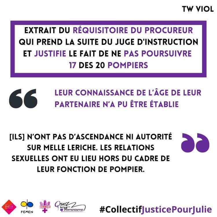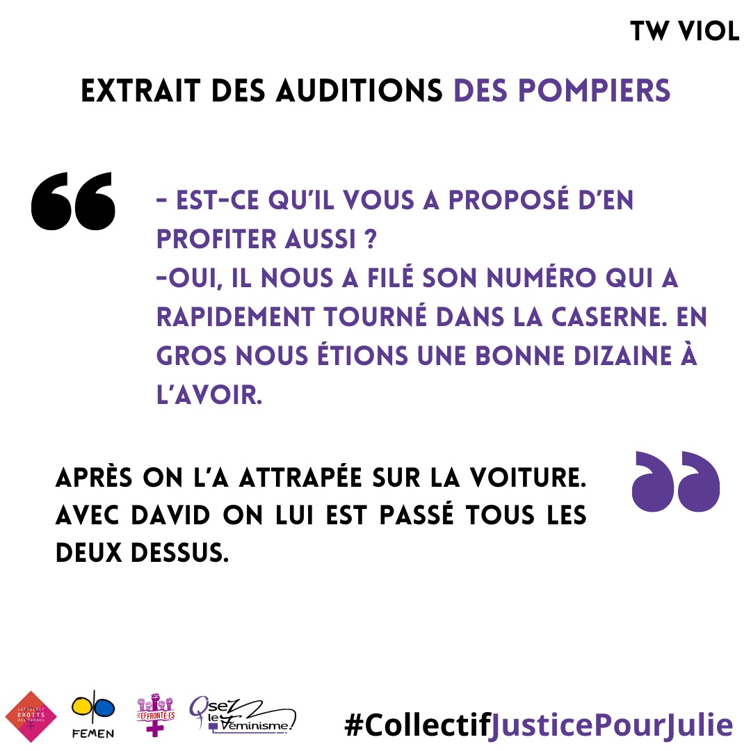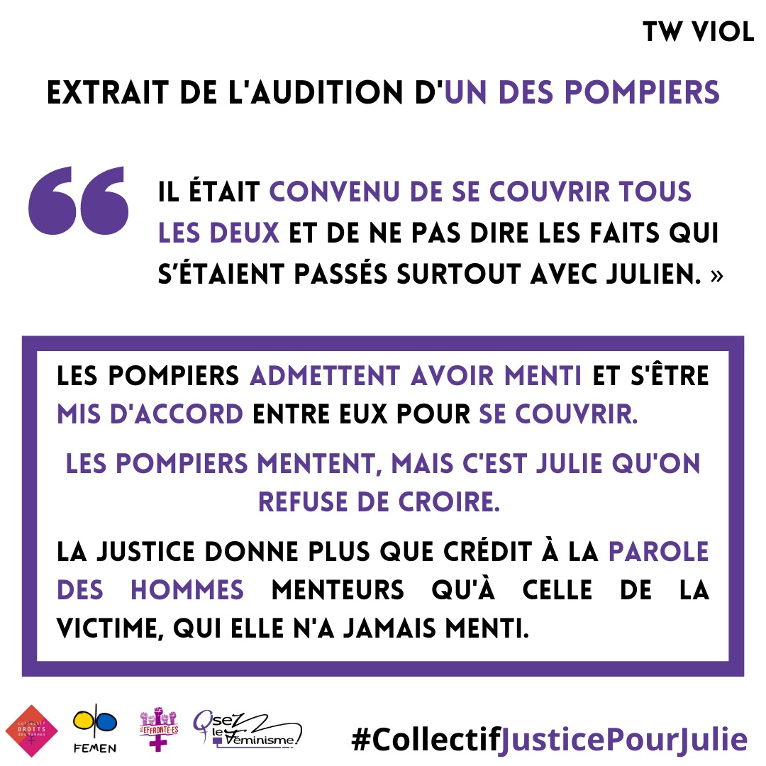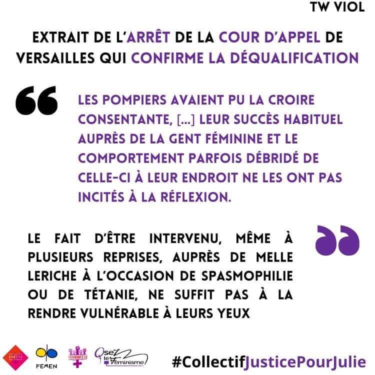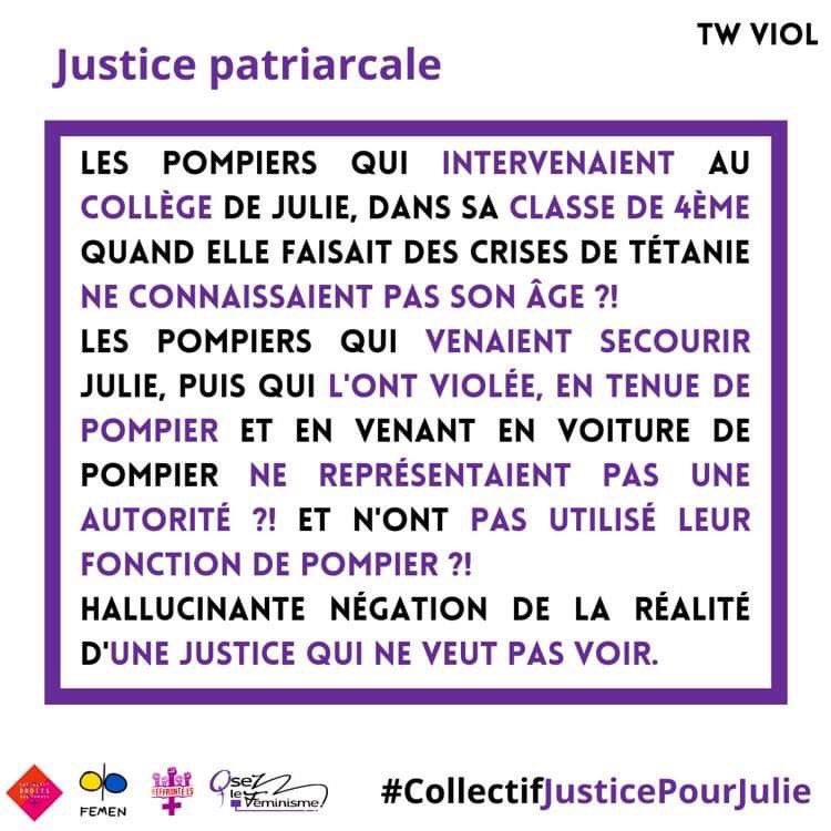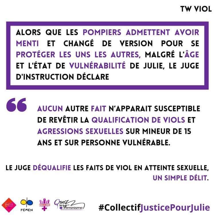 Alors que des viols commis par 20 pompiers de Paris, subis par Julie entre 13 et 15 ans, ont été déqualifiés en atteinte sexuelle, un large ensemble de militant·e·s et de représentant·e·s d’associations féministes et de lutte contre la pédocriminalité dénoncent un grave «déni de justice».
