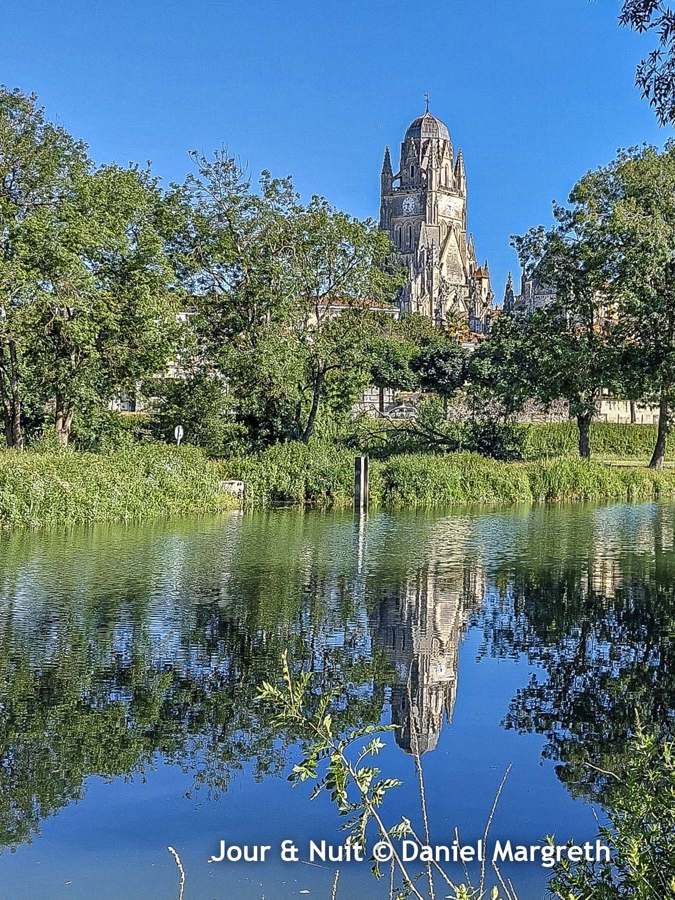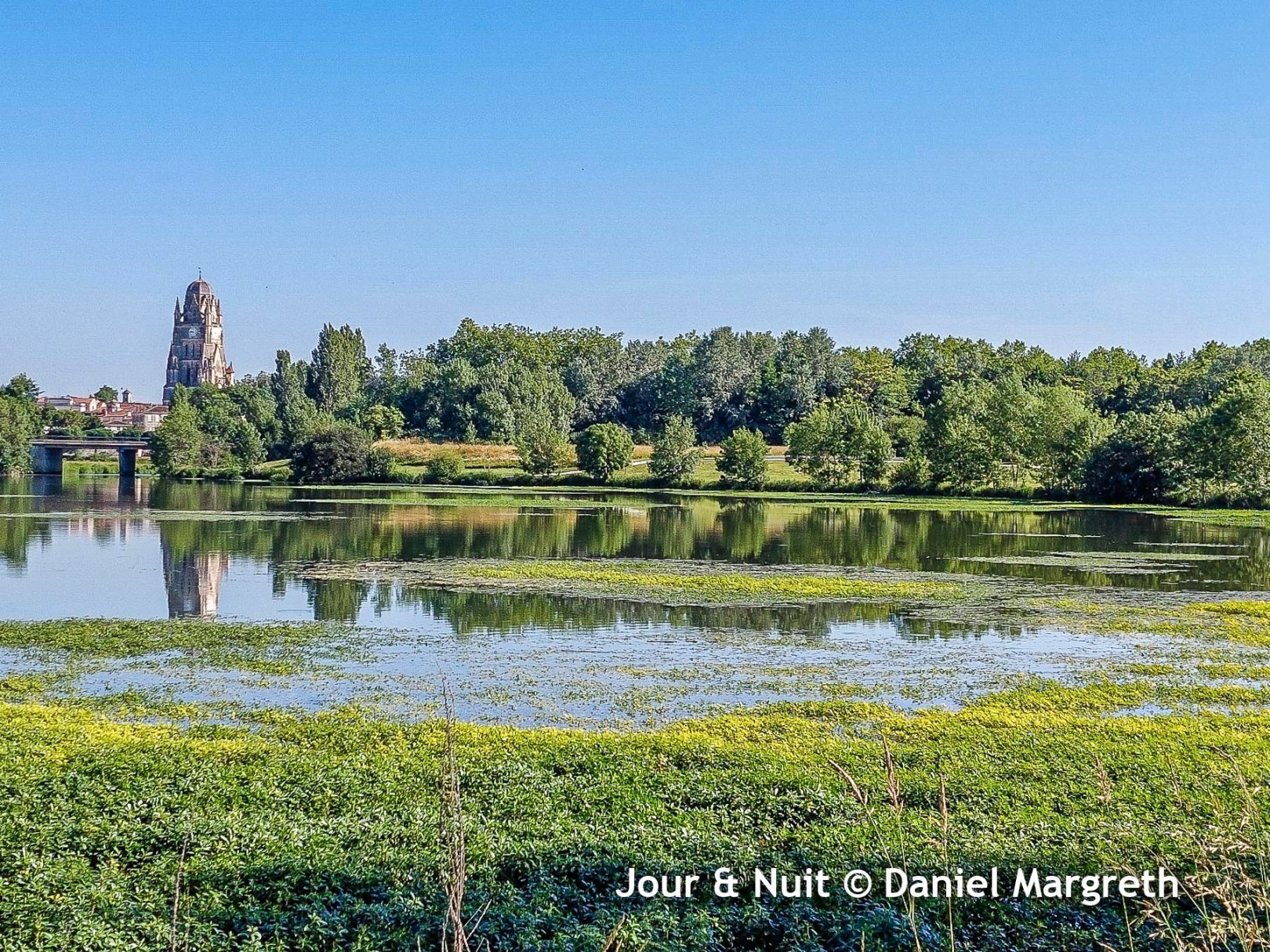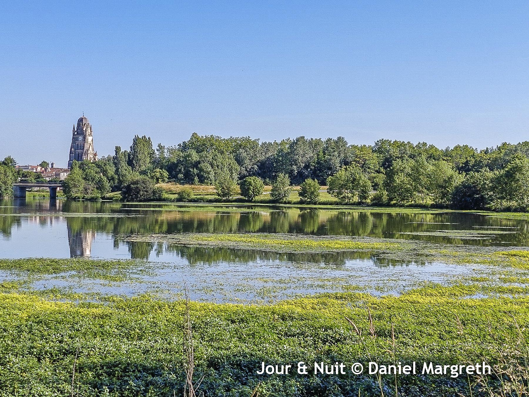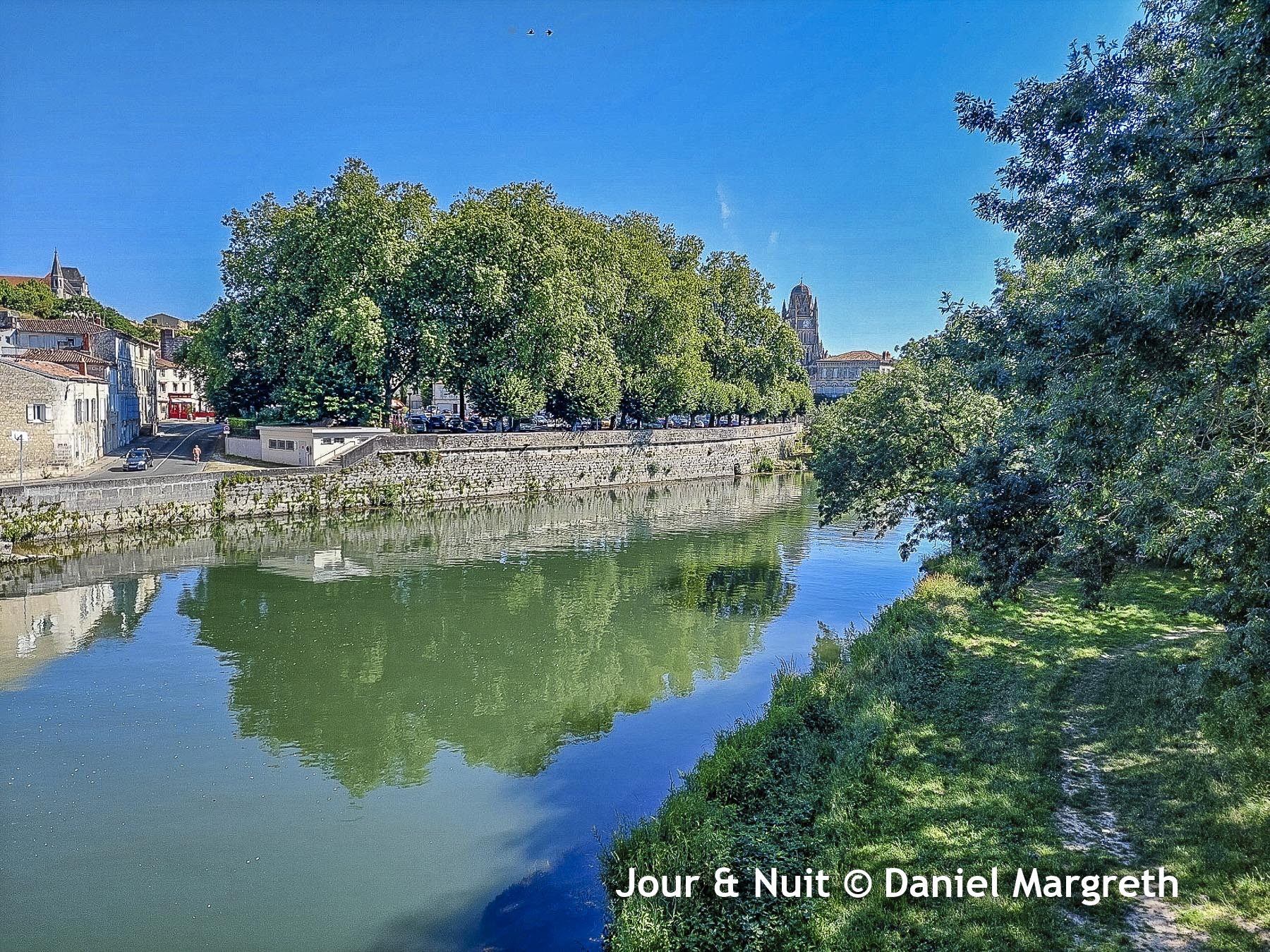 Je suis parti ce matin vers 9h00 de chez moi car la journée s’annonce très chaude comme depuis une semaine et je me suis dirigé à travers le parc de la résidence directement sur le bord de la Charente qui la borde et je l’ai suivi vers le centre ville de Saintes par le quai des Roches et le Quai de Verdun jusqu’à la passerelle face à la cathédrale St Pierre que j’ai franchi pour aussitôt reprendre le chemin de halage le long du Jardin Public et ensuite du canal qui traverse La Palu.