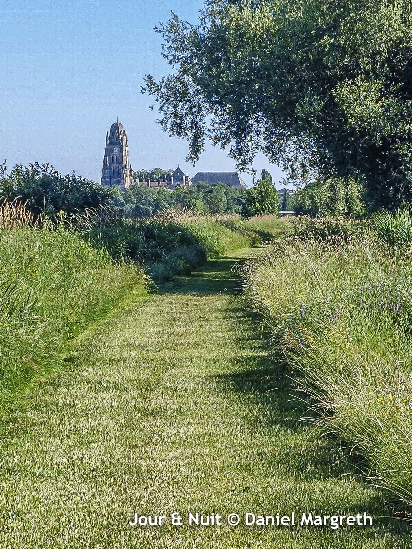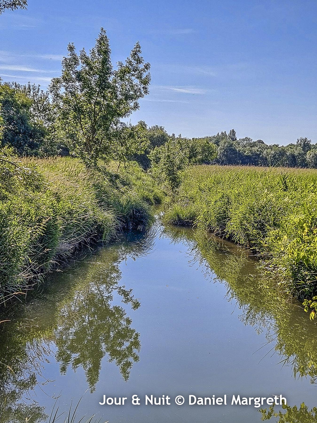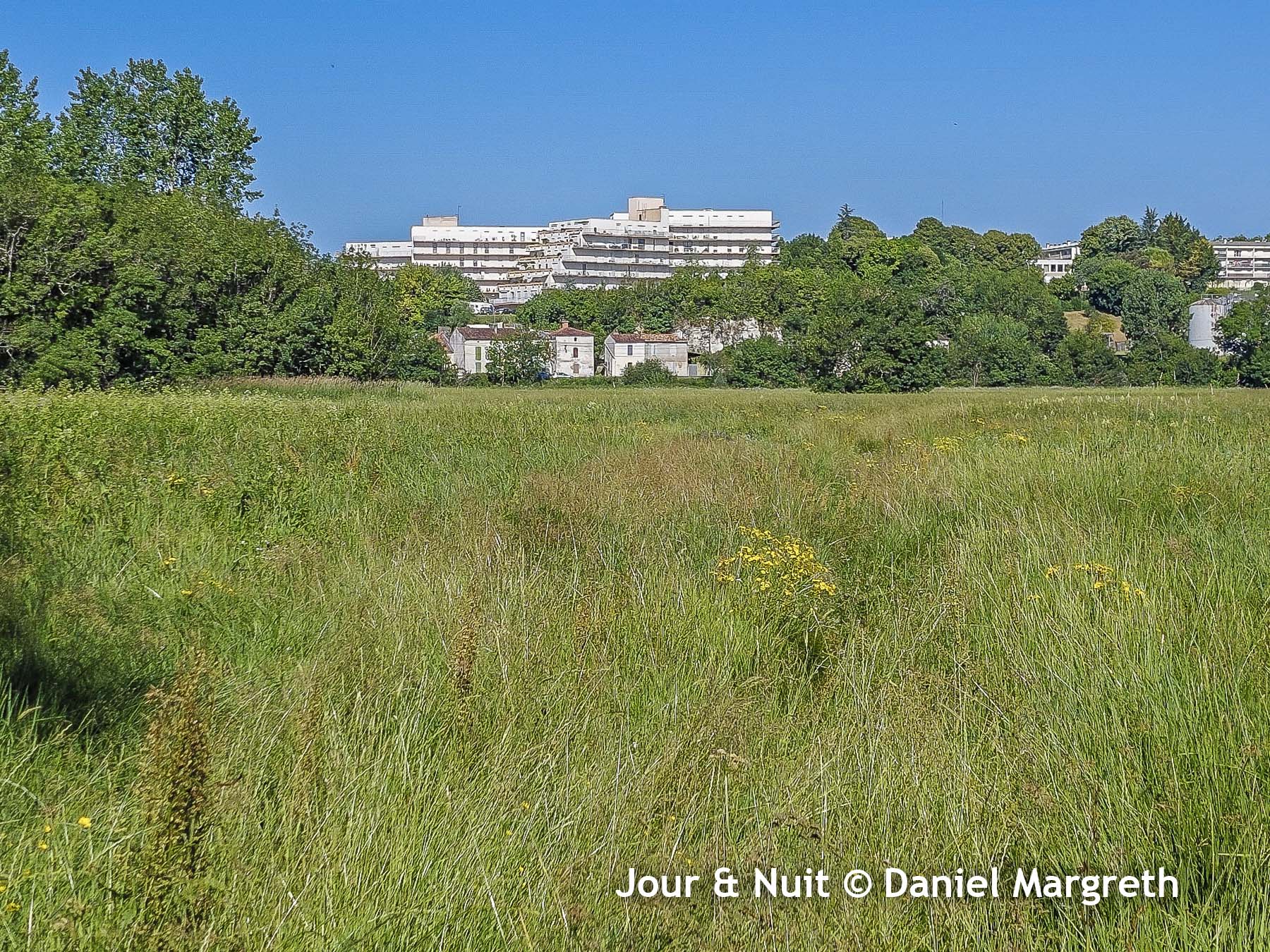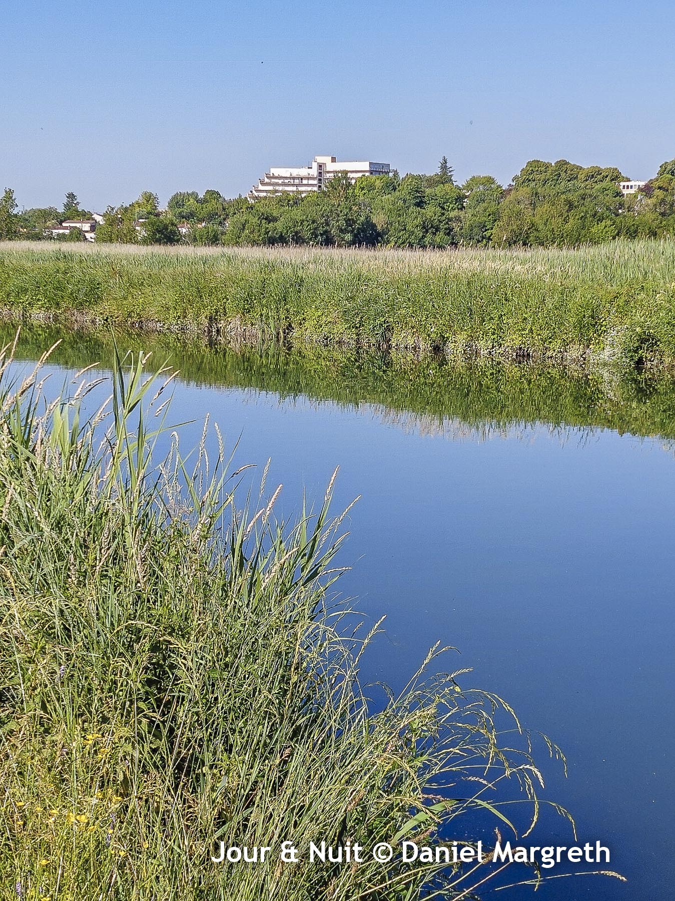 Je suis parti ce matin vers 9h00 de chez moi car la journée s’annonce très chaude comme depuis une semaine et je me suis dirigé à travers le parc de la résidence directement sur le bord de la Charente qui la borde et je l’ai suivi vers le centre ville de Saintes par le quai des Roches et le Quai de Verdun jusqu’à la passerelle face à la cathédrale St Pierre que j’ai franchi pour aussitôt reprendre le chemin de halage le long du Jardin Public et ensuite du canal qui traverse La Palu.