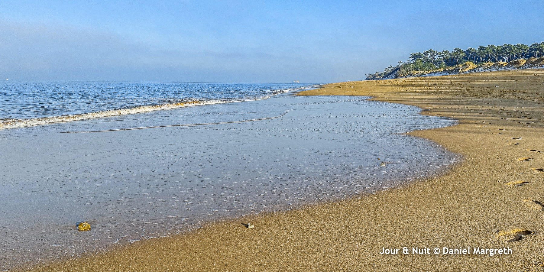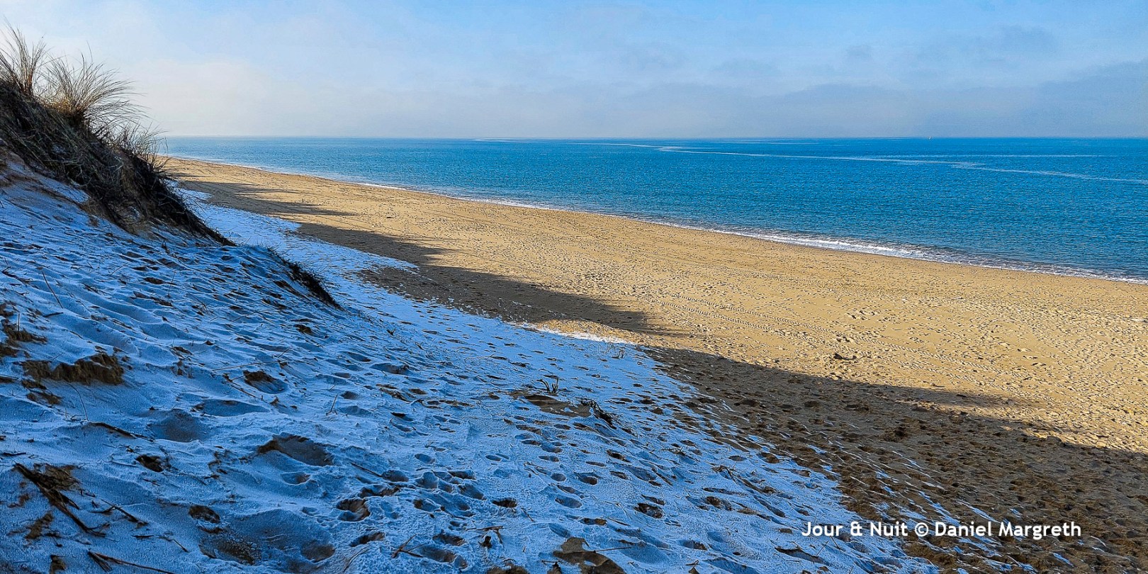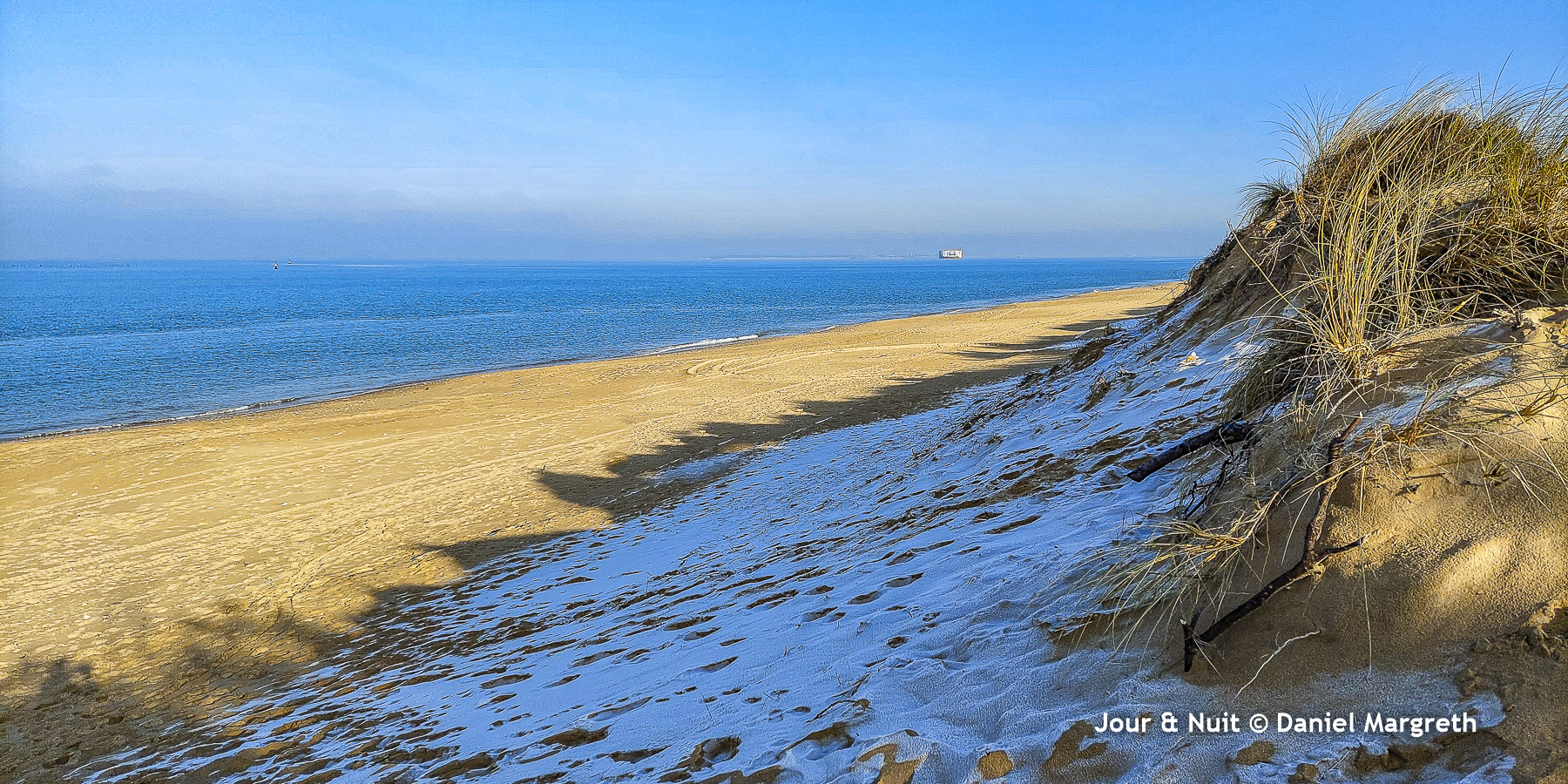 Une semaine après le 31 décembre où je m’y suis baigné avec une température de plus de 14 degrés et sous un soleil resplendissant, je franchis de nouveau le pont pour me rendre sur cette magnifique plage mais avec un changement de température important puisque le matin la gelée (jusqu’à -3 degrés) est visible sur le versant nord de la dune… Le creusement de la plage est aussi remarquable avec cette espèce de marche créée par les vagues depuis une semaine…