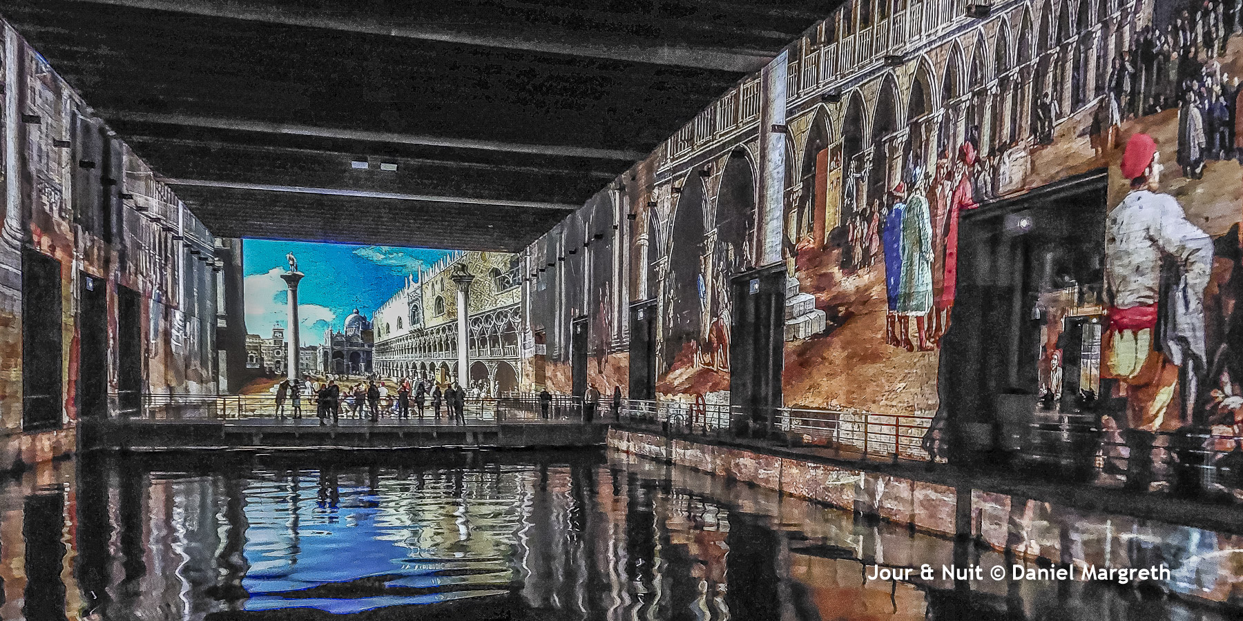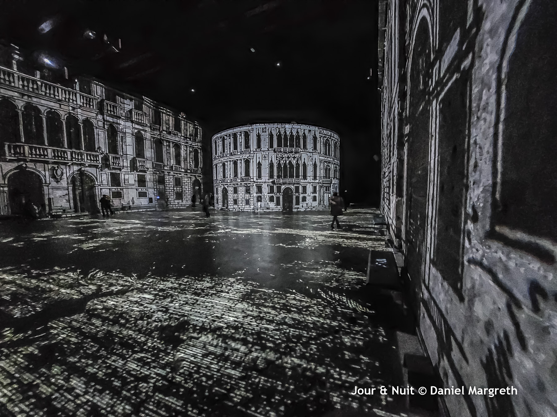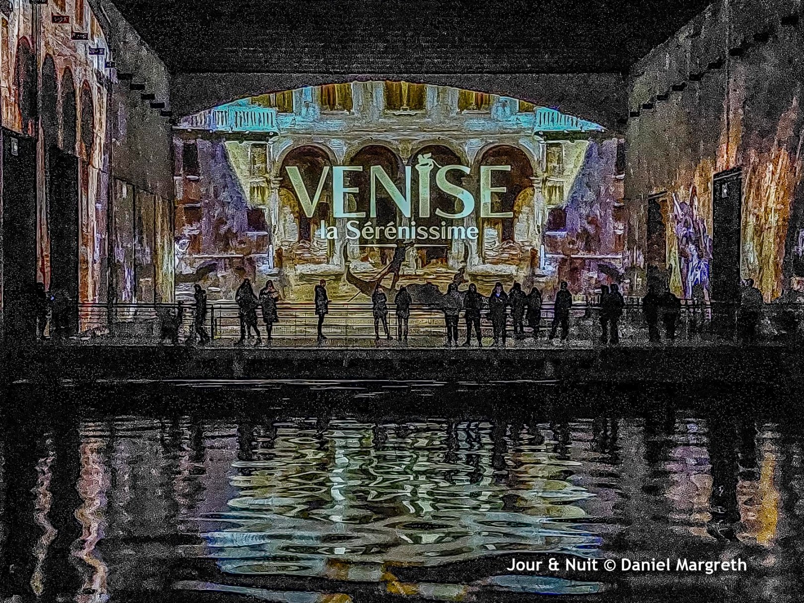L’exposition immersive propose un voyage exceptionnel à Venise et invite à découvrir ses trésors artistiques et architecturaux. En déambulant le long du Grand Canal et des canaux, des ruelles et des places, des bâtiments et des églises, le public est invité à une promenade entre intérieurs et extérieurs, sacré et profane, à la découverte d’un passé exceptionnel. En une quarantaine de minutes, le visiteur est immergé dans l’art byzantin et les mosaïques dorées de la basilique Saint-Marc, dans les chefs-d’œuvre du Tintoret, de Bellini ou de Canaletto ou encore dans la fameuse Mostra del Cinema avec des photographies d’actrices et acteurs du néoréalisme italien.