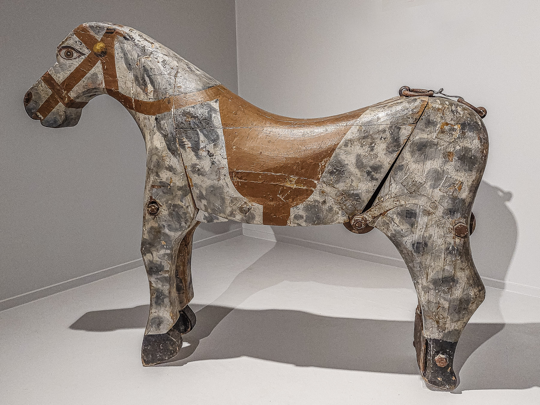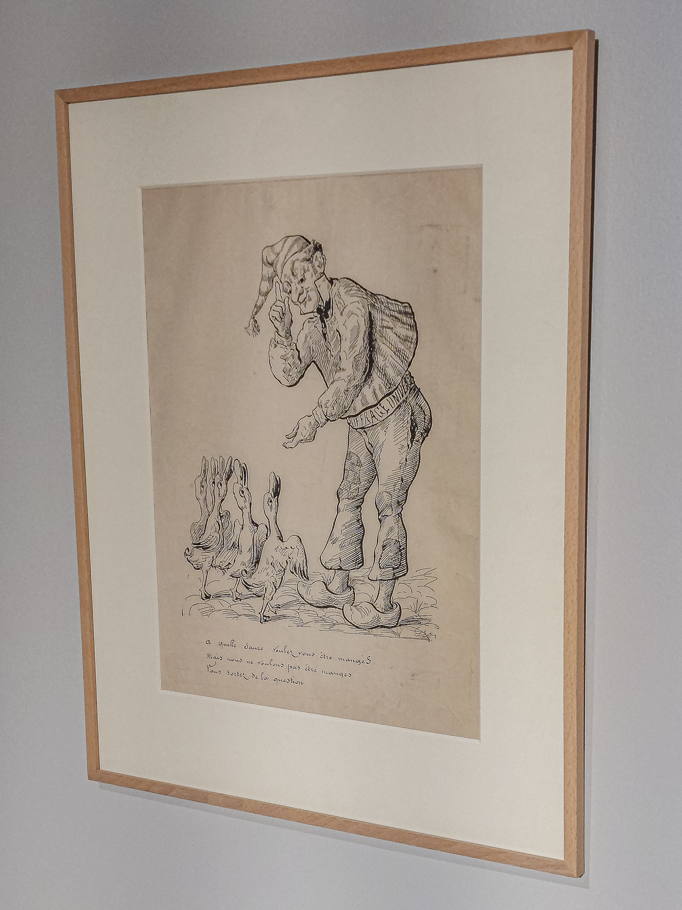 Je vous propose également deux photos, l’une d’un cheval verseur de la fin du XIX ème siècle (bois polychrome) qui était utilisé, lors des fêtes de villages, comme un jeu aquatique sur le bord de l’Indre et de la Vienne, et l’autre d’une caricature sur le suffrage universel du XIX ème siècle (papier et encre) représentant un homme debout portant un bonnet et une ceinture marquée « Suffrage universel » qui interroge 5 canards: