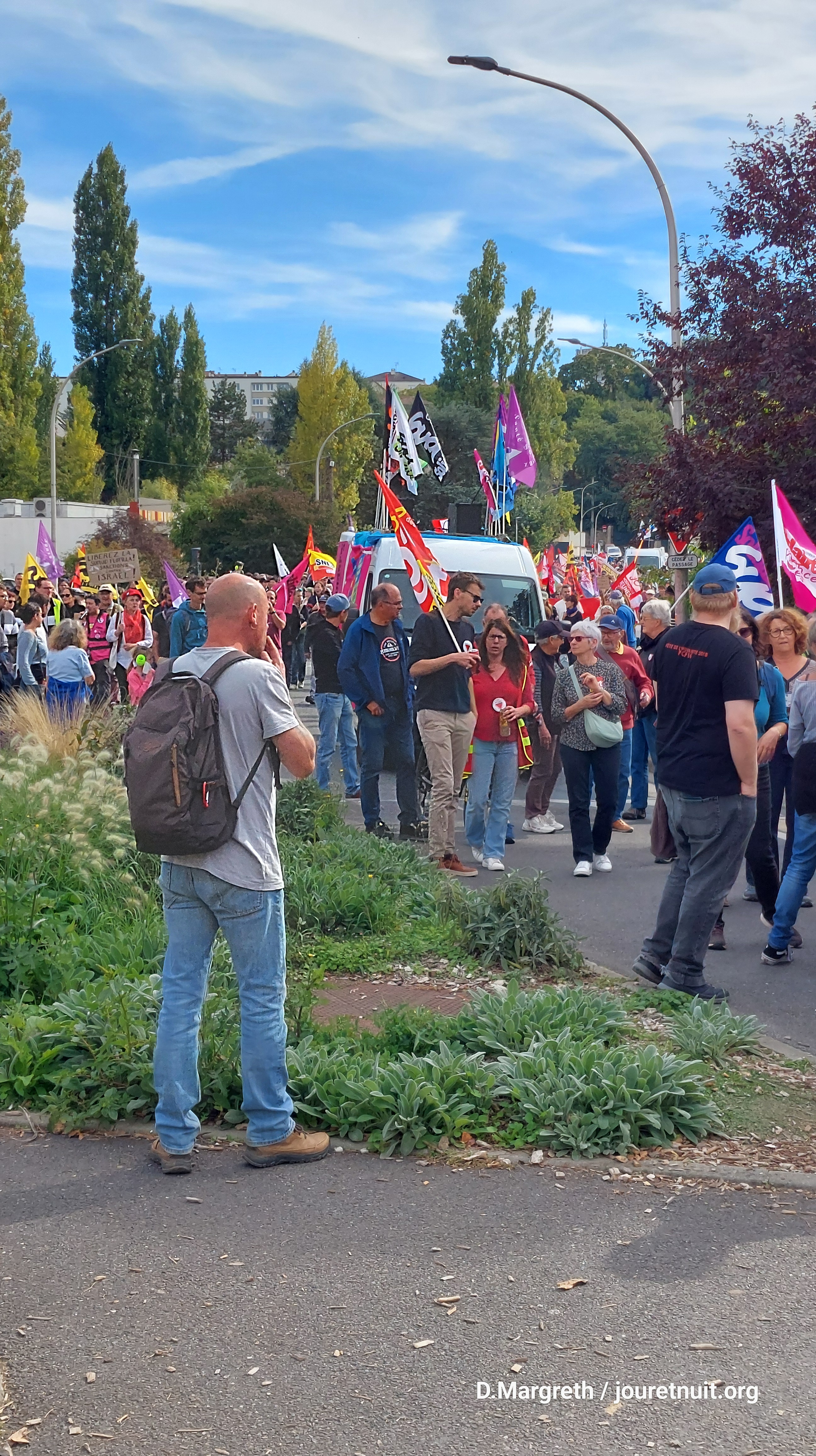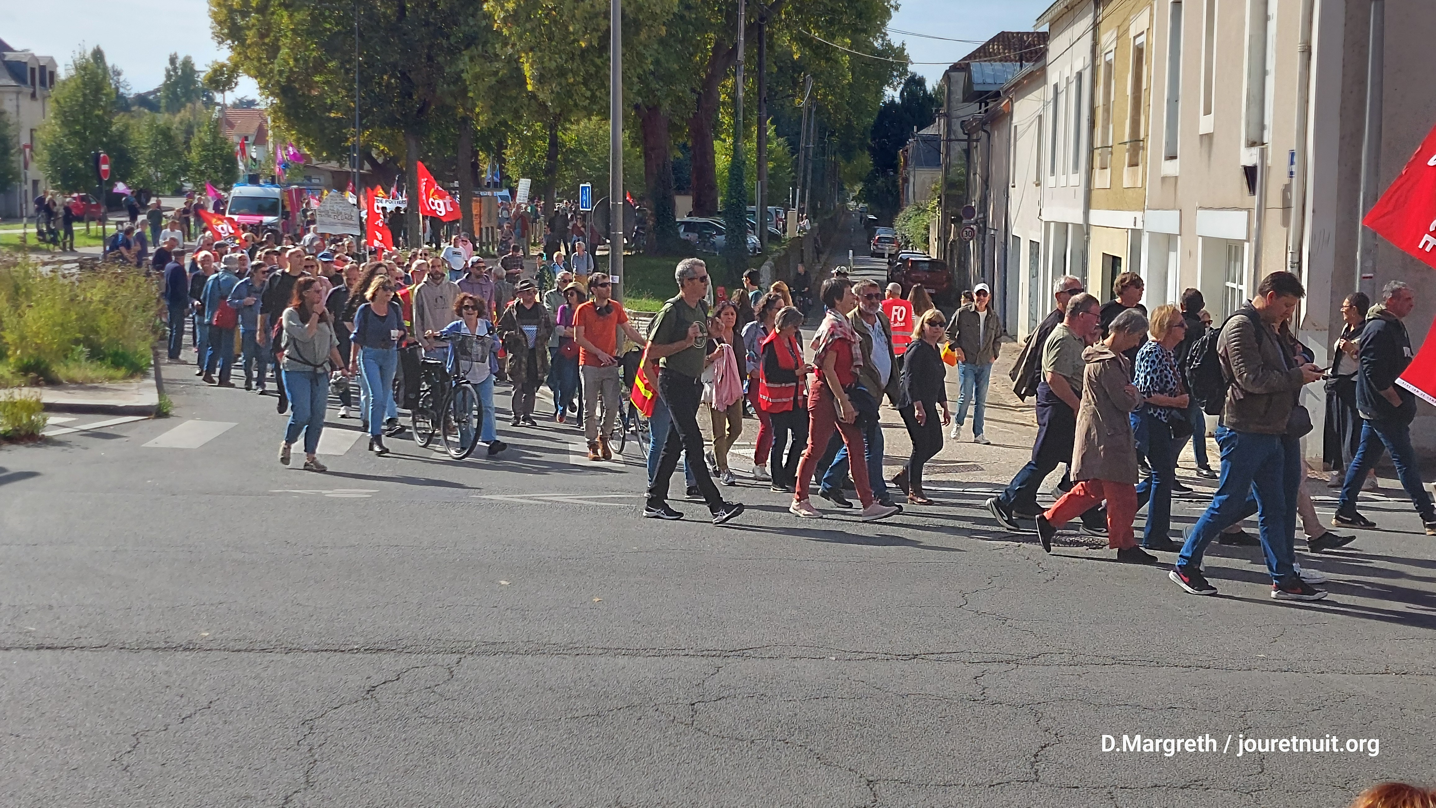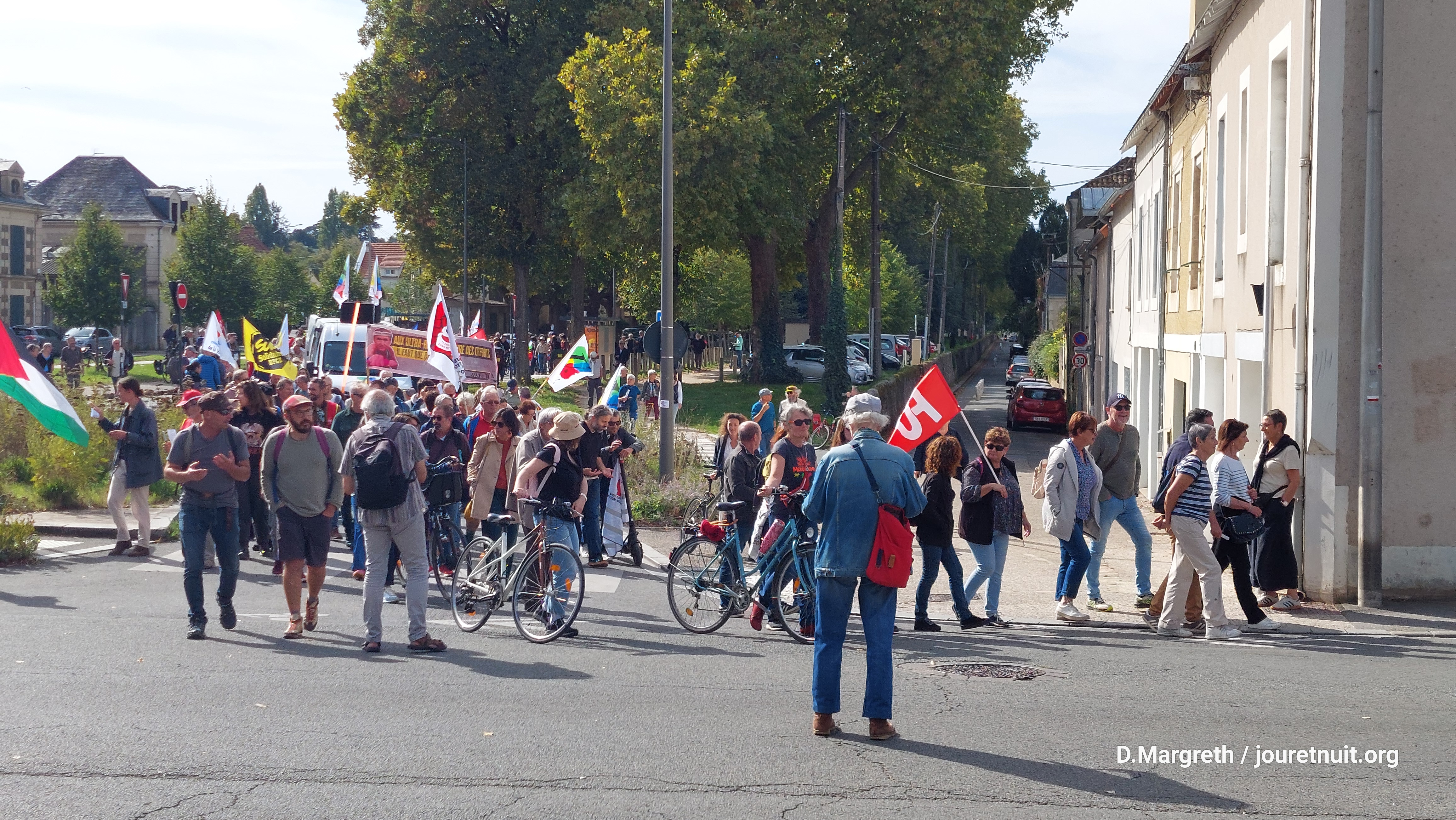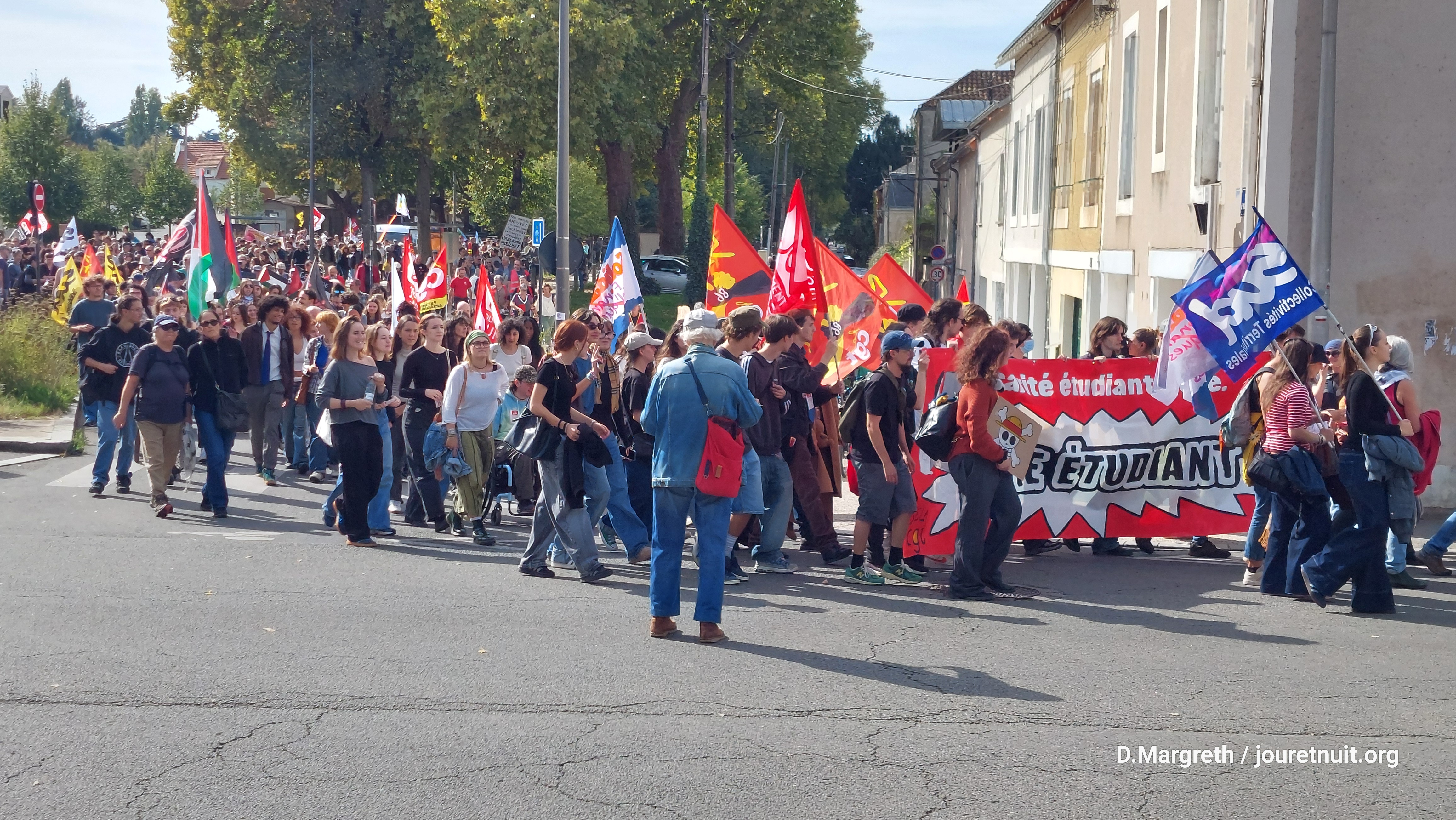 A 14h, la manifestation a démarré pour franchir le pont Saint Cyprien puis monter au centre-ville par les boulevards François Albert et de Tison, pour bifurquer à droite le long du Parc Blossac, puis les rues de Blossac, Scheurer Kestner, Alsace Lorraine et Magenta jusqu’à l’Hôtel de Ville…