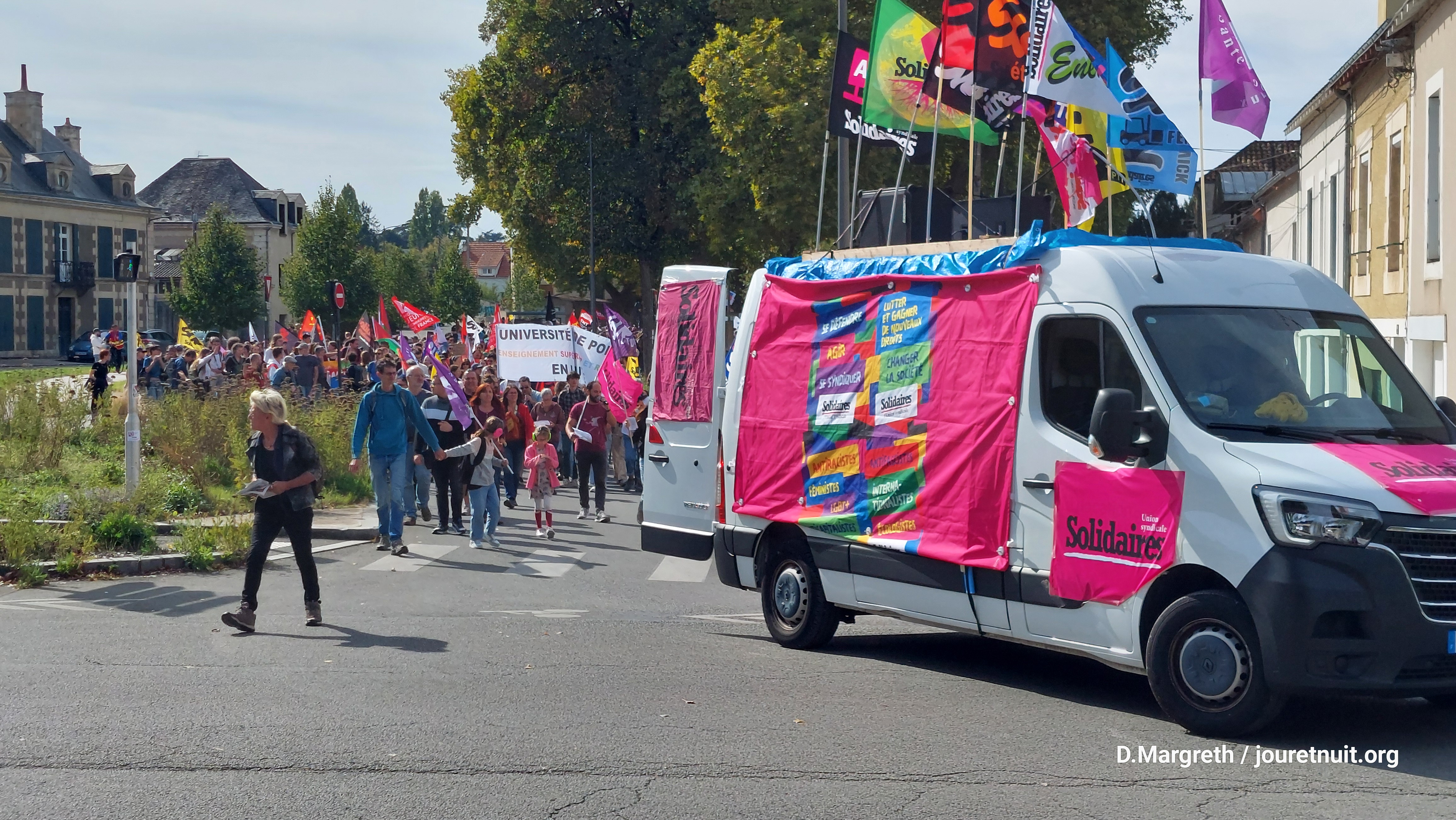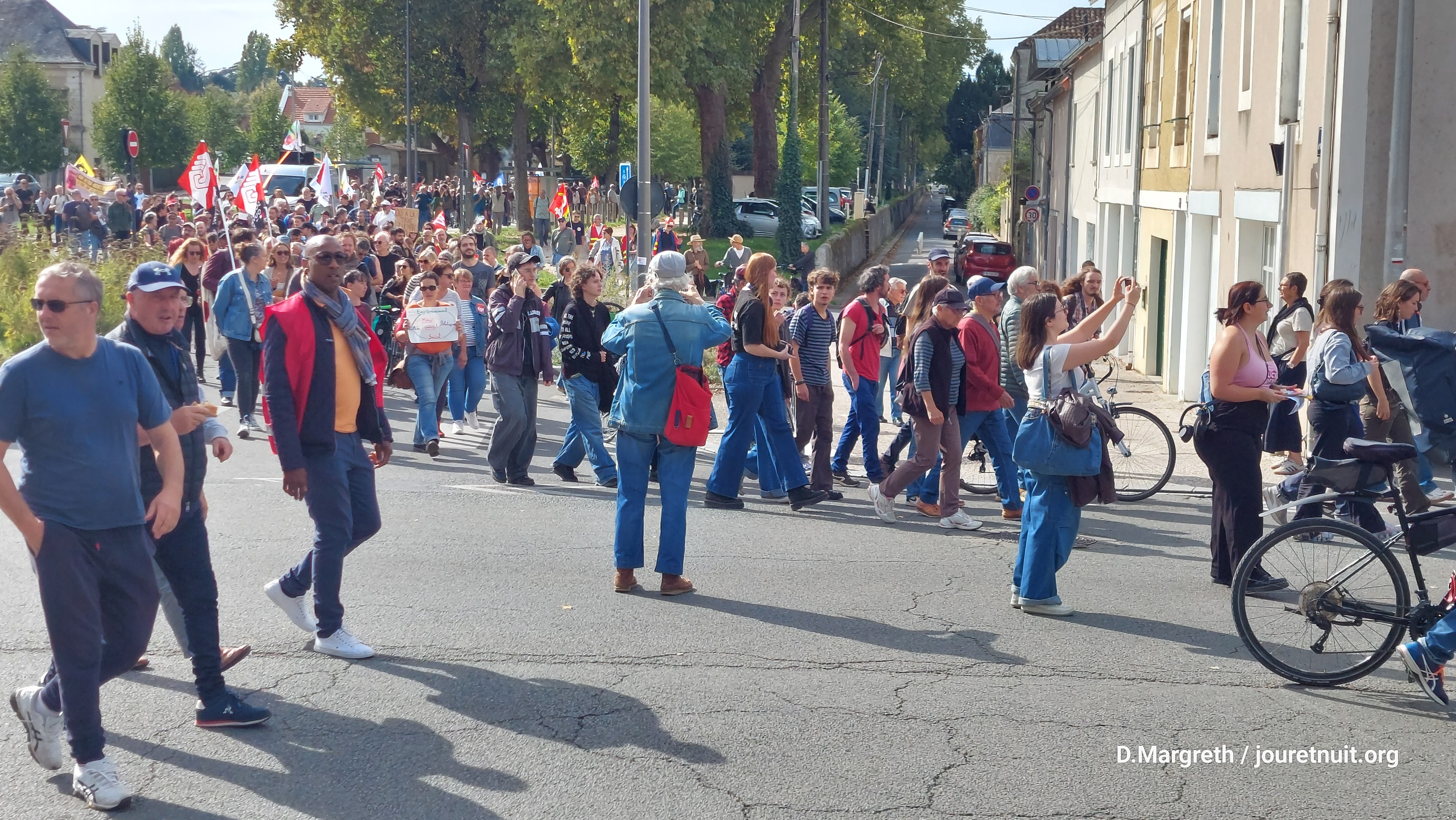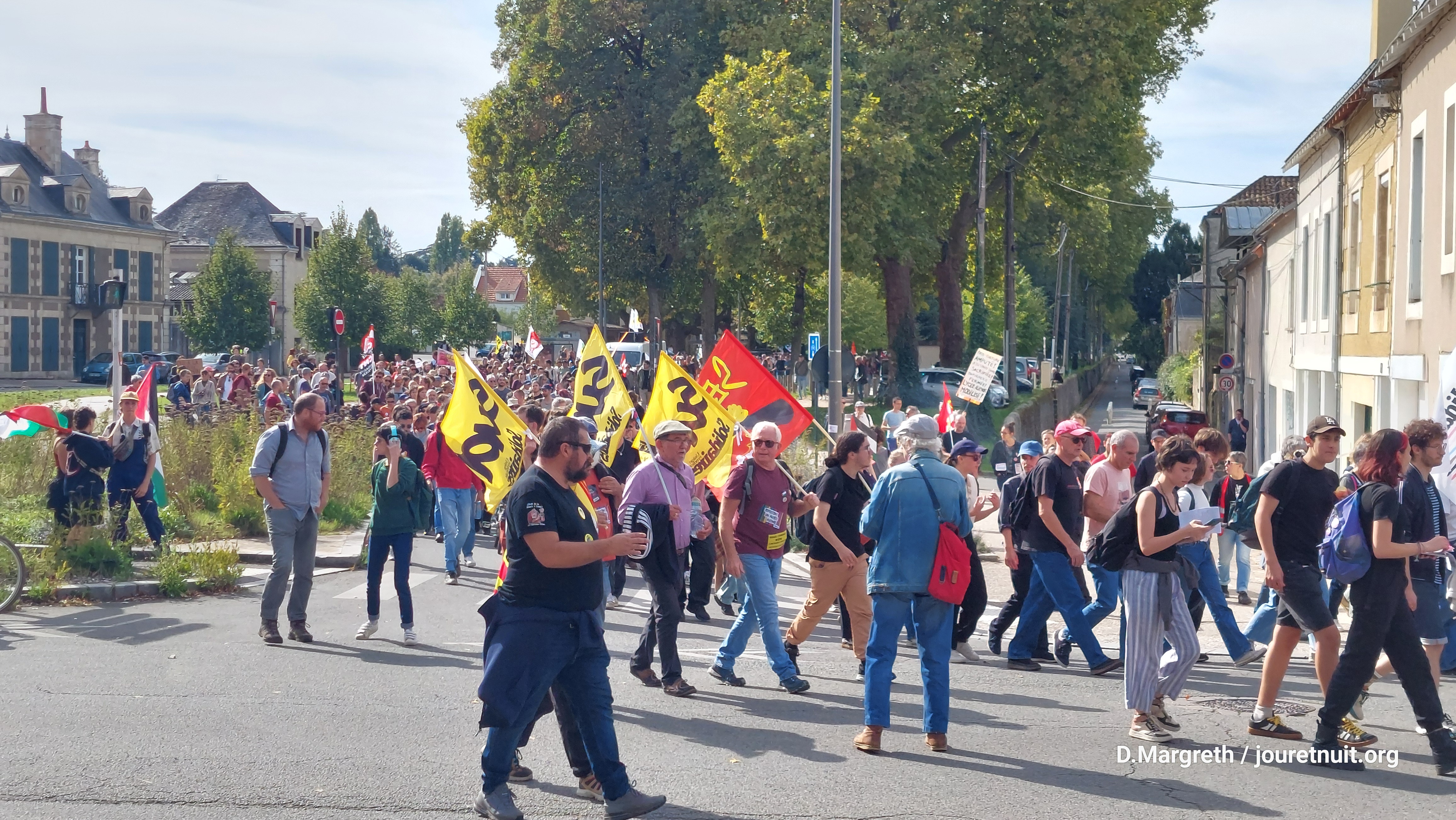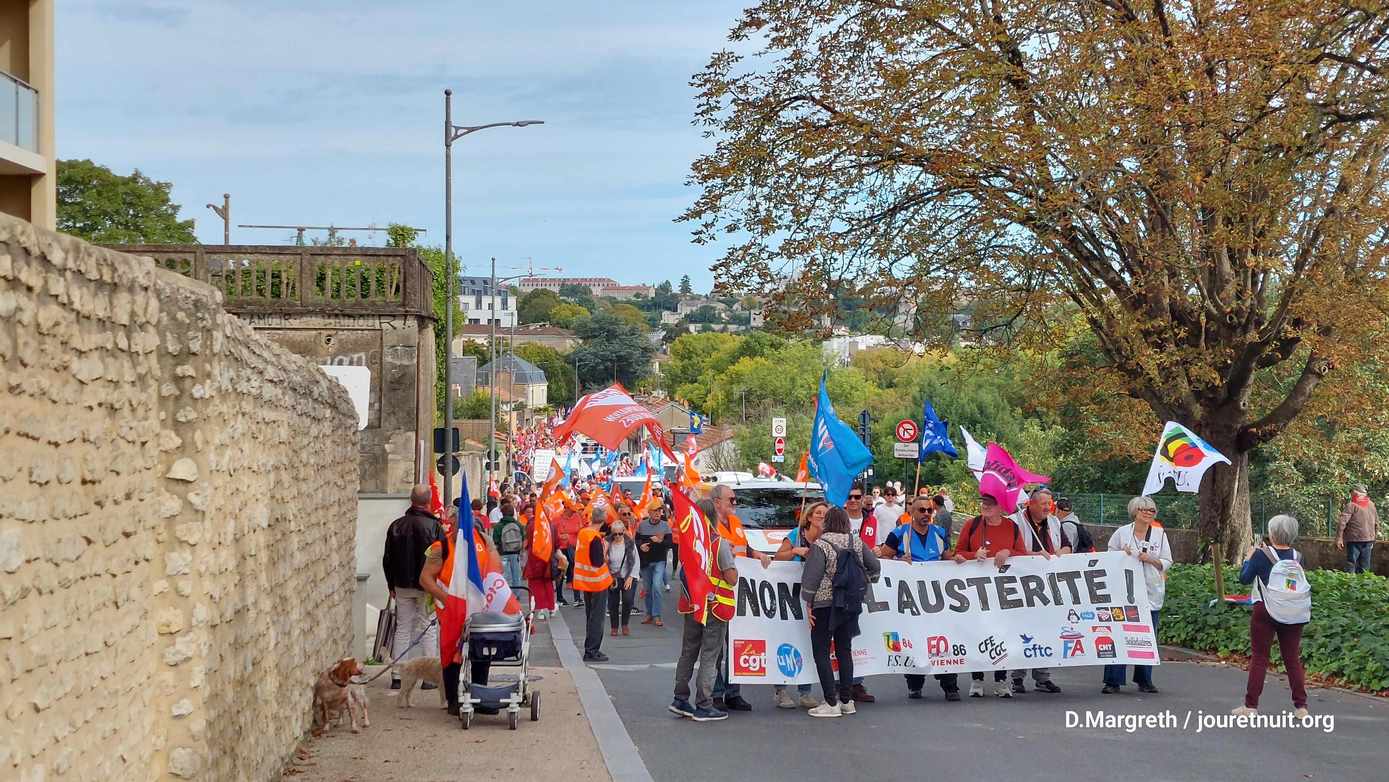 A 14h, la manifestation a démarré pour franchir le pont Saint Cyprien puis monter au centre-ville par les boulevards François Albert et de Tison, pour bifurquer à droite le long du Parc Blossac, puis les rues de Blossac, Scheurer Kestner, Alsace Lorraine et Magenta jusqu’à l’Hôtel de Ville…