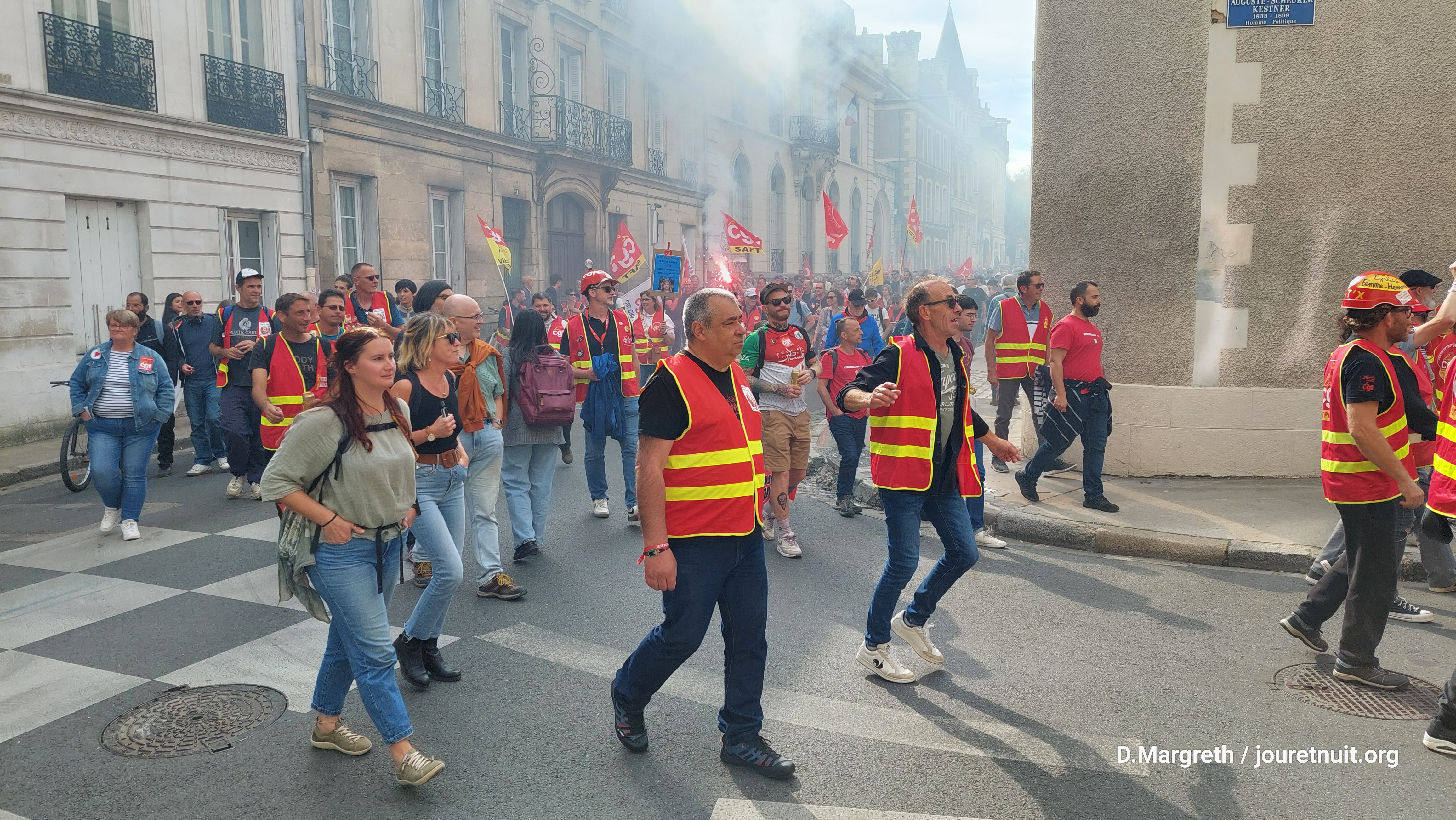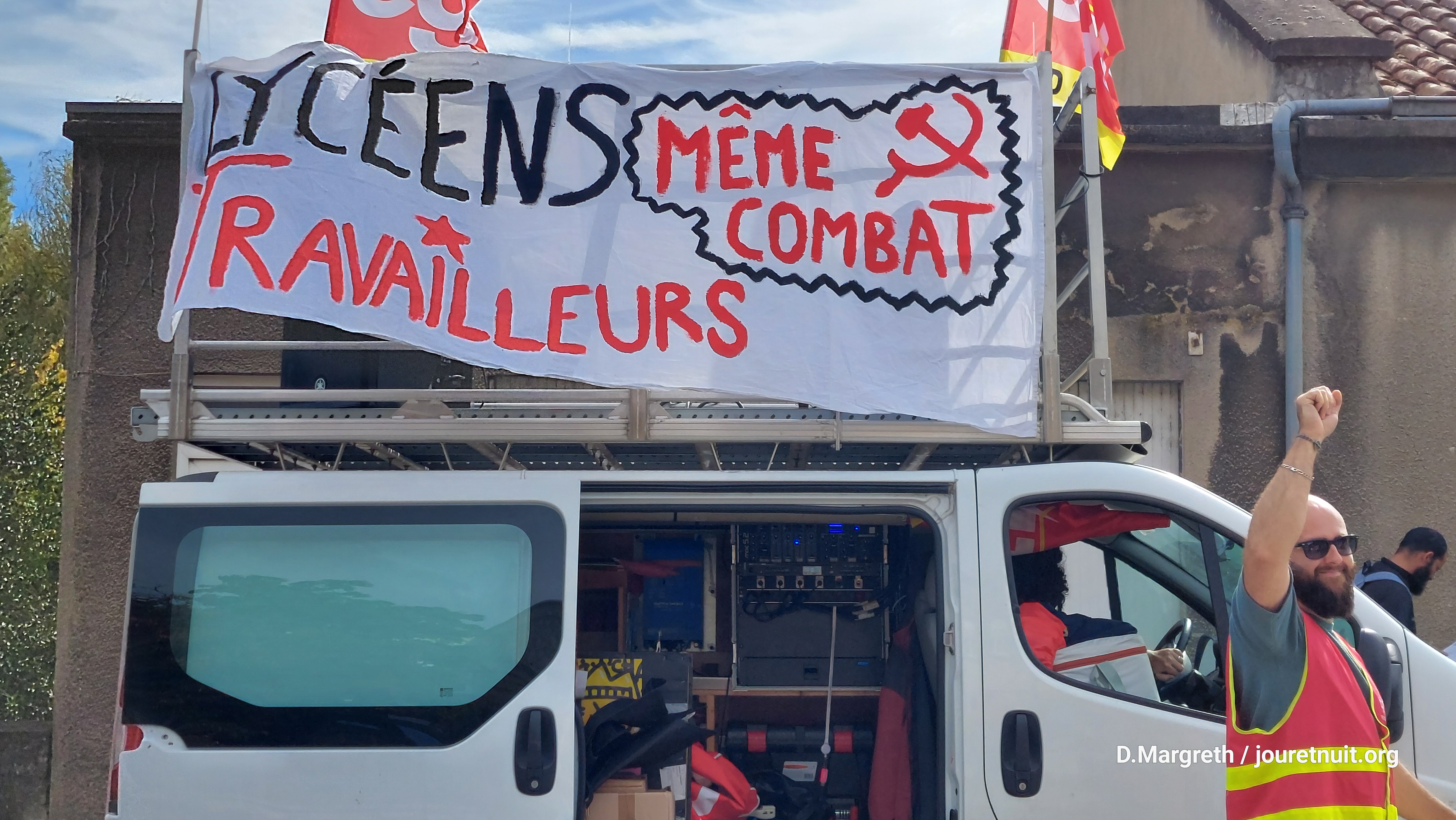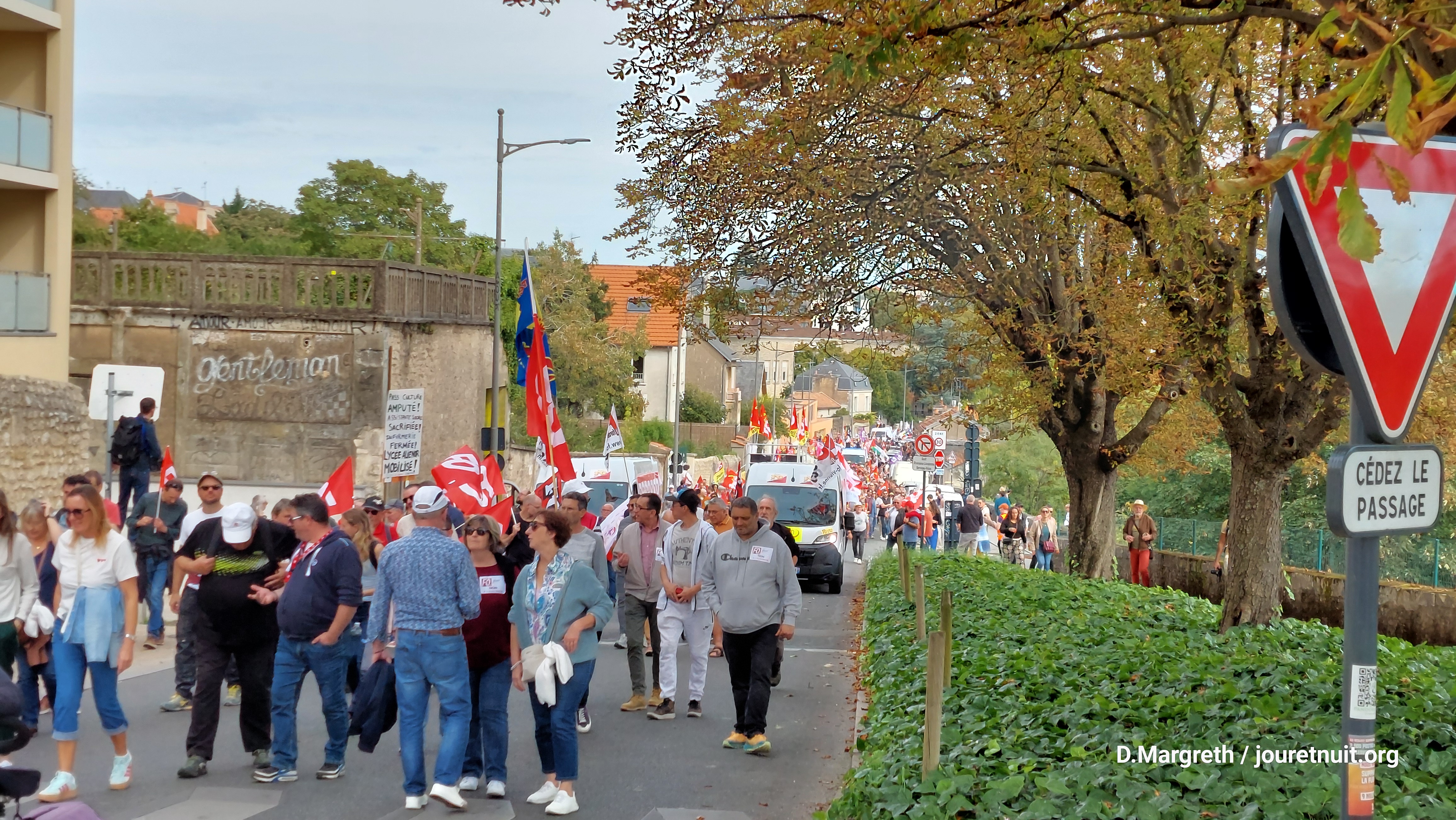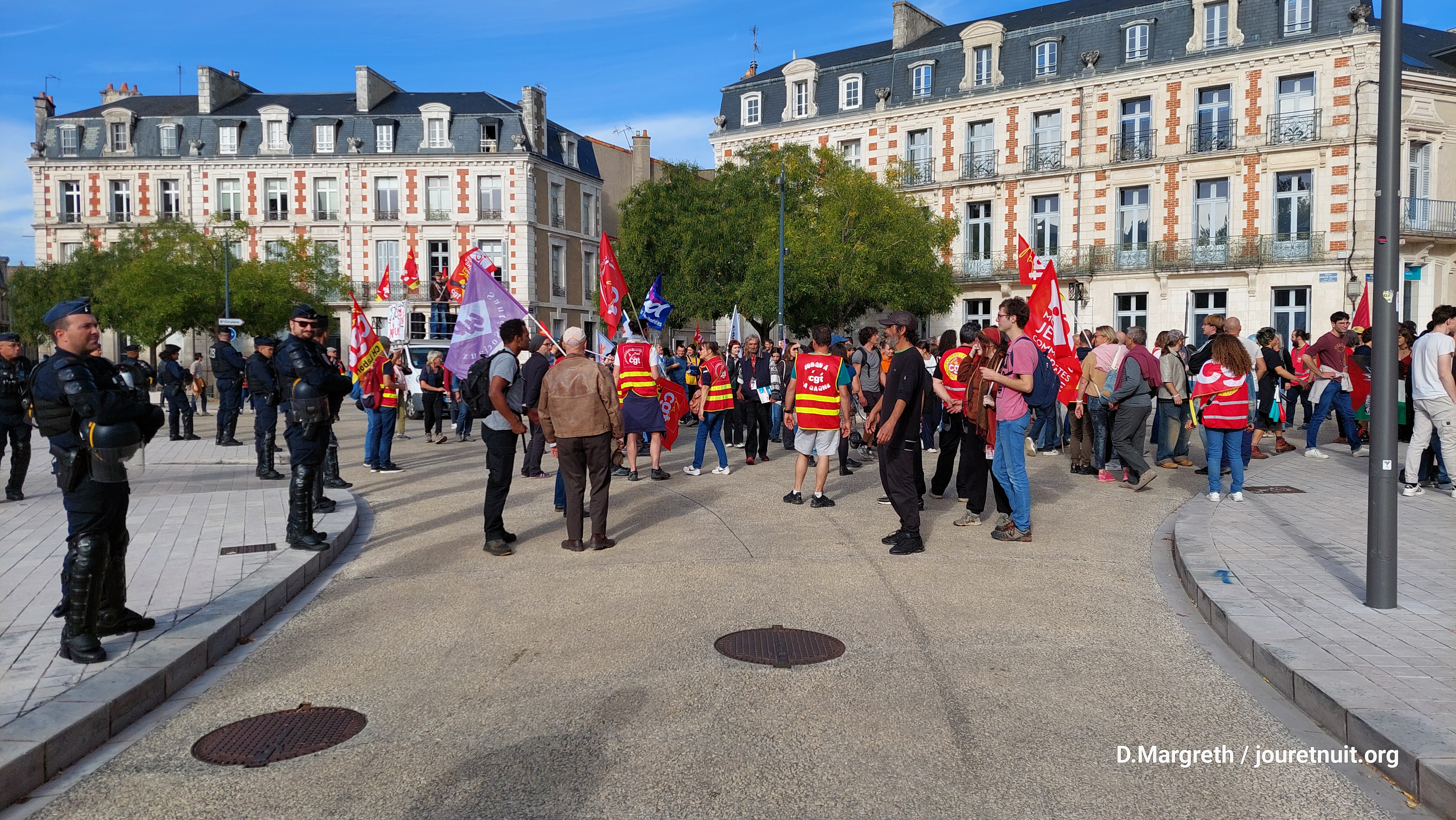 Au bout de 100 mètres, les jeunes décidèrent de prendre le chemin des « écoliers », toujours avec le camion sono de la CGT et se dirigèrent vers la place Notre Dame puis les rues de l’université, Cloche Perse, Croix Blanche, Gaston Hulin, Henri Pétonnet et enfin rue des Ecossais jusqu’à la Préfecture où les attendaient des CRS (environ 60) placés devant les grilles du bâtiment! Après une prise de paroles de la CGT, tout le monde se dispersa sans aucun problème.